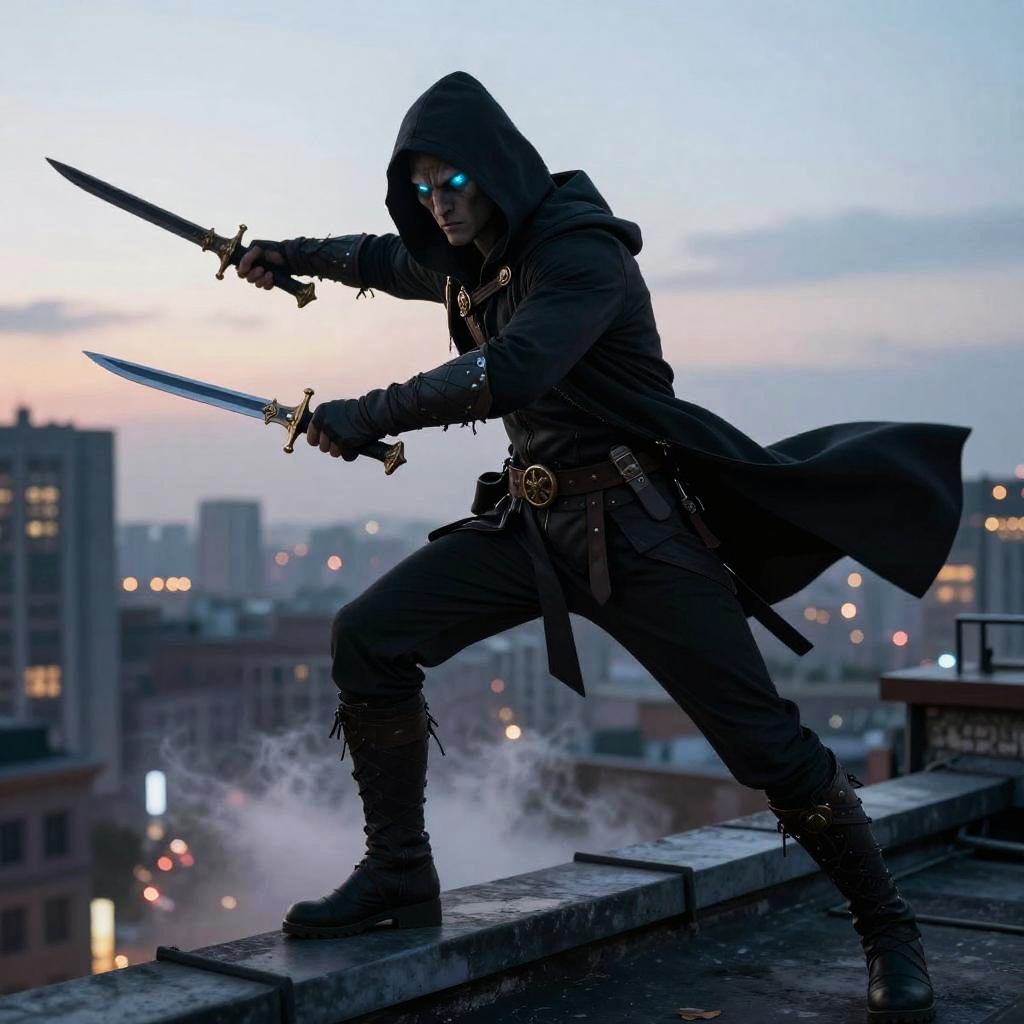 Ratfolk rogue poised on a rooftop at dusk, agile and nimble with a hooded cloak, holding twin daggers, eyes glowing mysteriously, mist swirling below in a bustling cityscape.