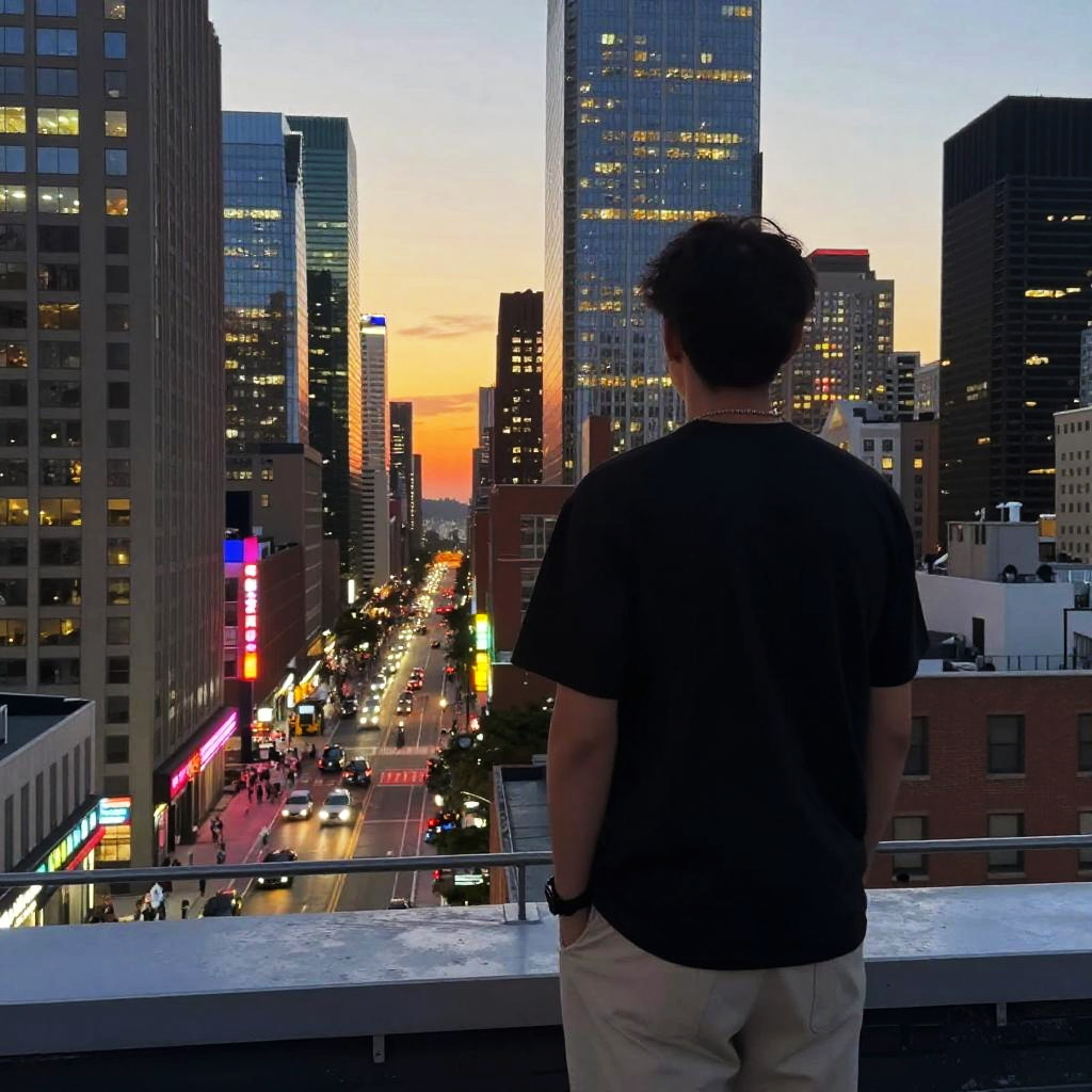 Person facing backwards on a bustling city rooftop at sunset, overlooking skyscrapers, neon lights starting to glow, casual urban outfit, vibrant and dynamic scene