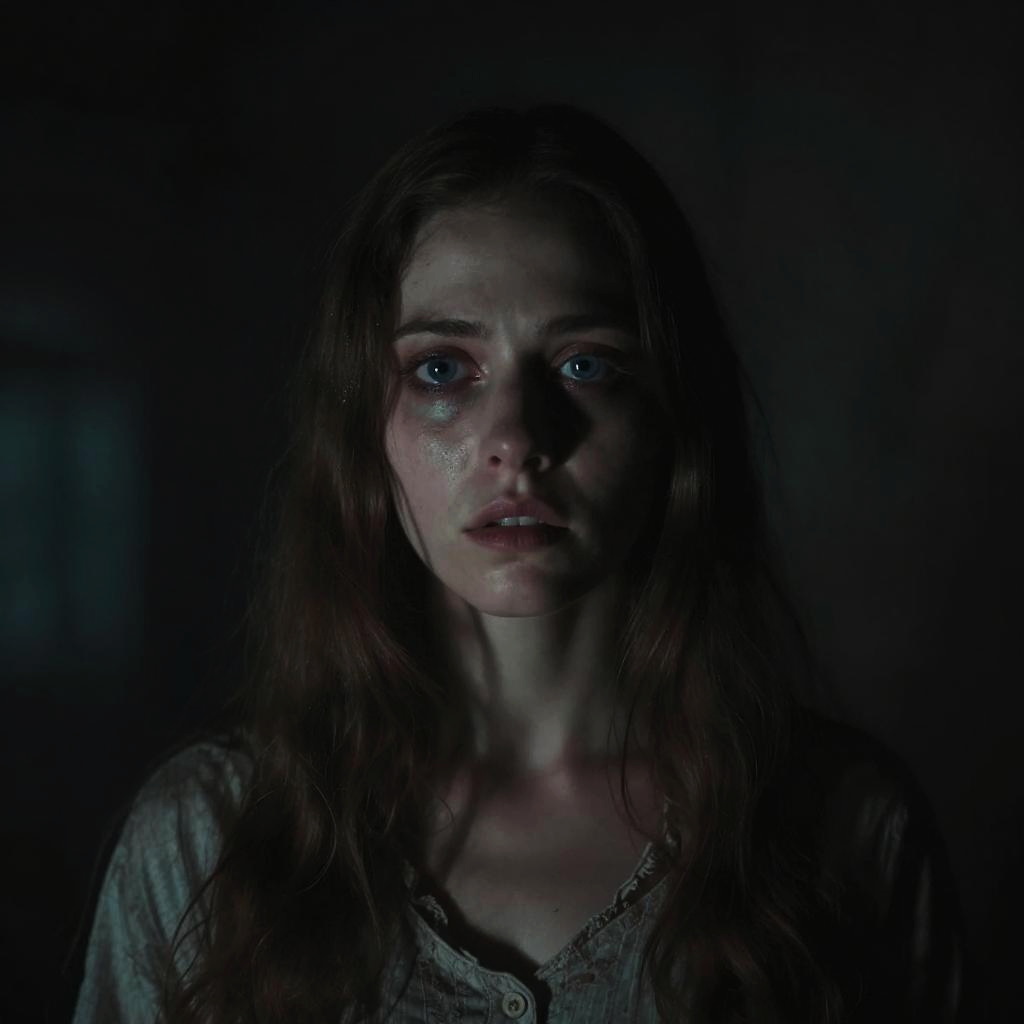 Dark, dramatic photograph of a young woman with long brown hair, tear-streaked face, and blue eyes, illuminated from below, wearing a worn
