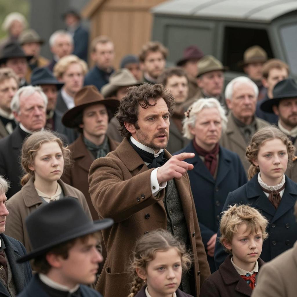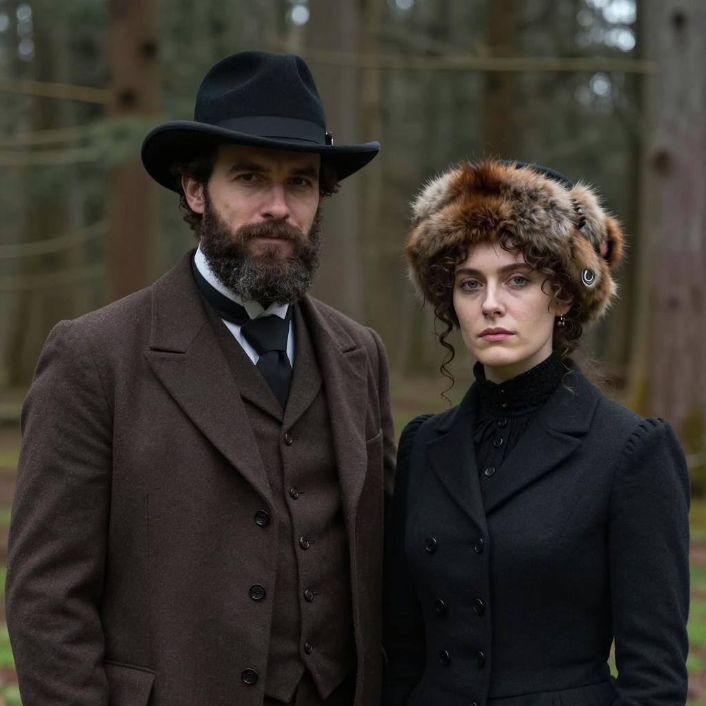 A man with dark hair and beard, in a brown jacket and vest, holding a glass and eating. A woman with brown hair in a red plaid shirt holds a sleeping baby with a white bonnet. Background includes blurred figures in old-fashioned clothing. Table with a glass of beer in the foreground.