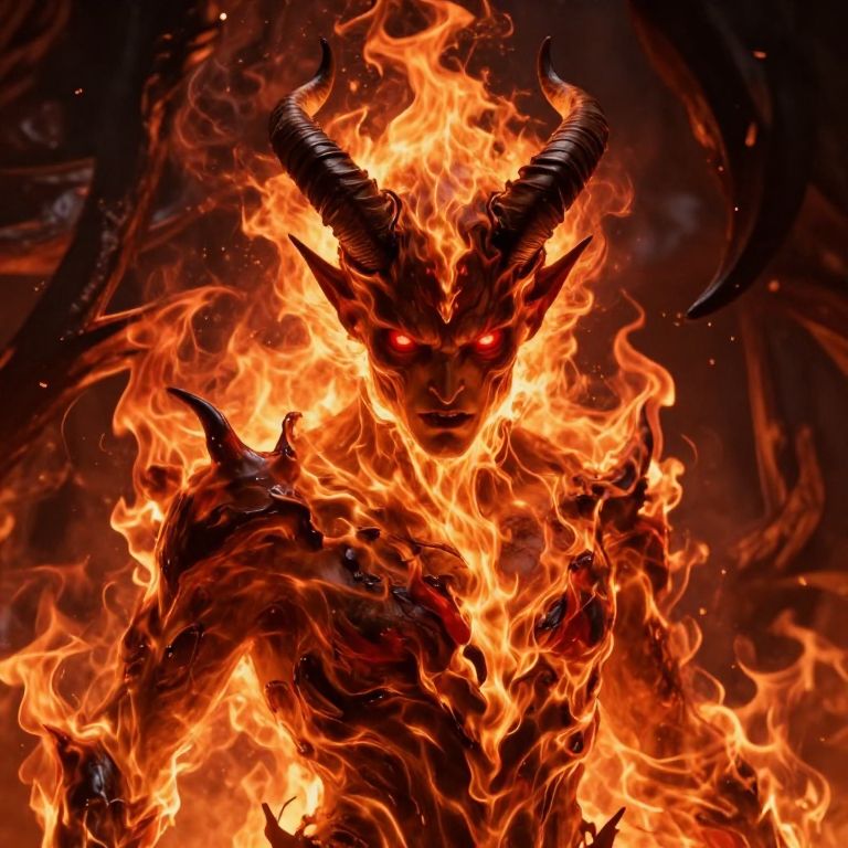 A pic of the devil depicted as a fiery, horned figure with glowing red eyes, surrounded by swirling flames and dark shadows, in a dramatic and intense fantasy art style, with sharp details and a menacing atmosphere