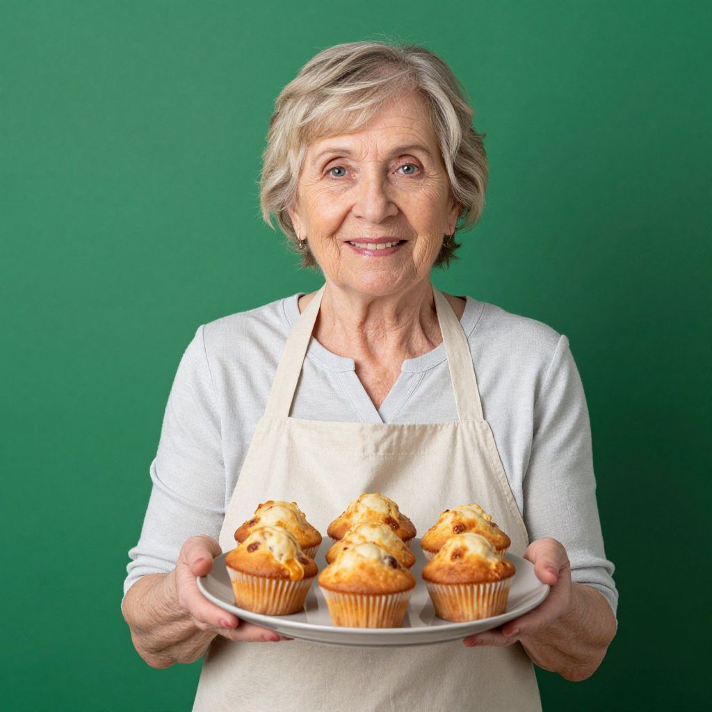 Photograph of an elderly woman with short, gray hair and fair skin, smiling warmly at the camera. She wears a white long-sleeve shirt and a beige apron. She holds a white plate in both hands, presenting four golden-brown muffins with visible fruit pieces. The background is a solid green color. The woman's wrinkles and gentle smile add a sense of warmth and homeliness to the image, contrasting with the bright green backdrop. The muffins are evenly spaced on the plate, and the woman's apron has a simple, practical design.