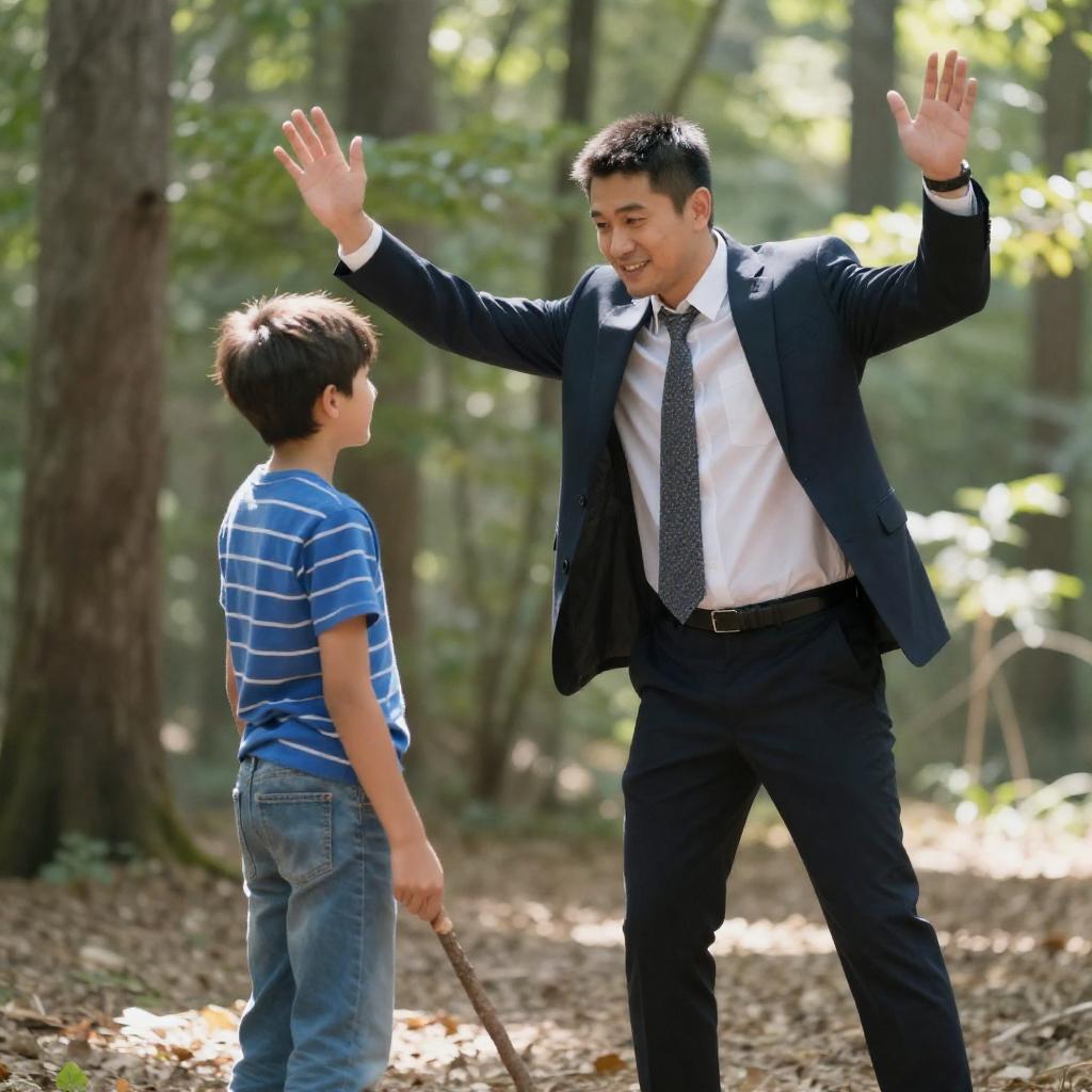 A man and a young girl running down a narrow alley. The man is wearing a black hat, black jacket, blue jeans, and black shoes, raising his right hand as he runs. The girl is dressed in a light blue tracksuit and white sneakers, running joyfully beside him. The alley features a green house on the right and a chain-link fence on the left, with trees visible in the background.