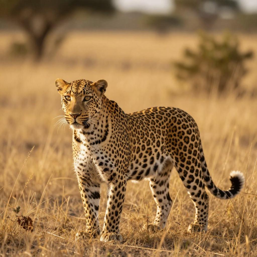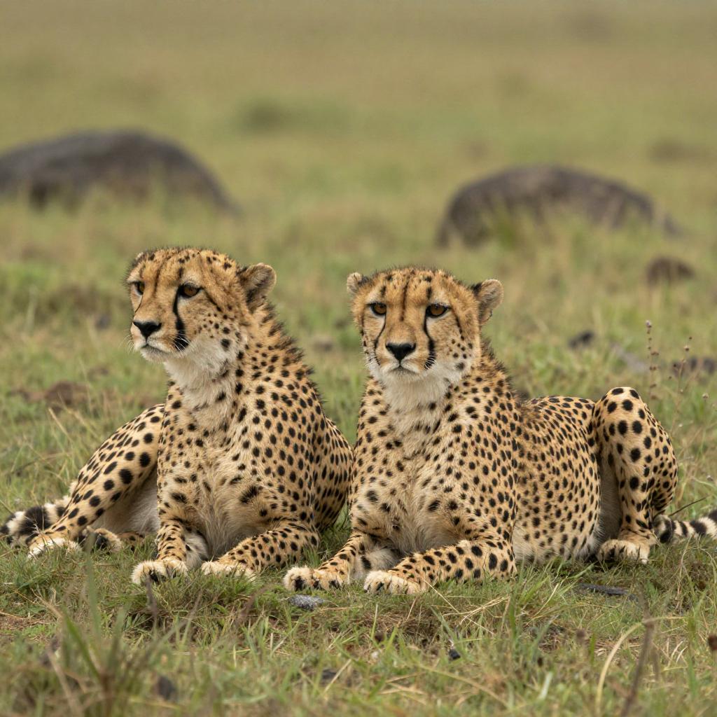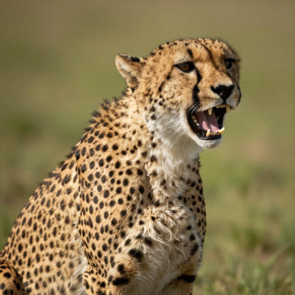 Photograph of a cute cheetah cub sitting on dry, sunlit ground with a clear blue sky background. The cub has fluffy, brownish-gray fur with black spots, and a slightly serious expression. The camera angle is straight-on, capturing the cub's full body. The lighting is bright and natural, highlighting the cub's fur texture. The background is slightly blurred, creating a shallow depth of field that keeps the focus on the cub.