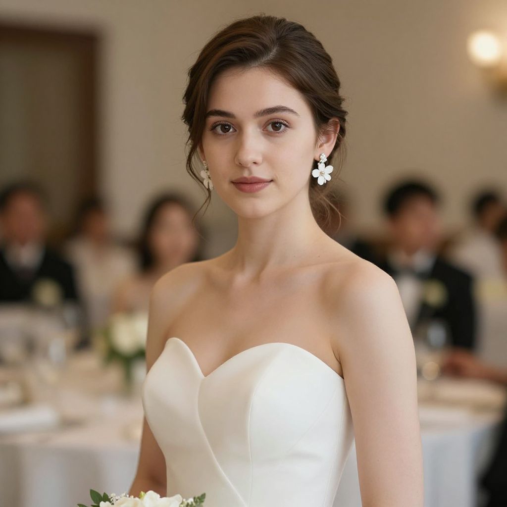 Wedding dress man reception, 1girl, solo, dress, brown hair, jewelry, flower, earrings, white dress, realistic, blurry, blurry background, brown eyes, looking at viewer