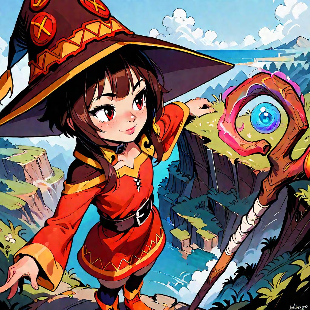 Score_9, score_8_up, score_7_up, score_6_up, girl (megumin) with flat chest standing, brown hair, witch hat, magic staff, smug, from above, spellmasterpiece, best quality, outdoors, highres, detailed anime style, cliff, (cutesexyrobutts:0.5)