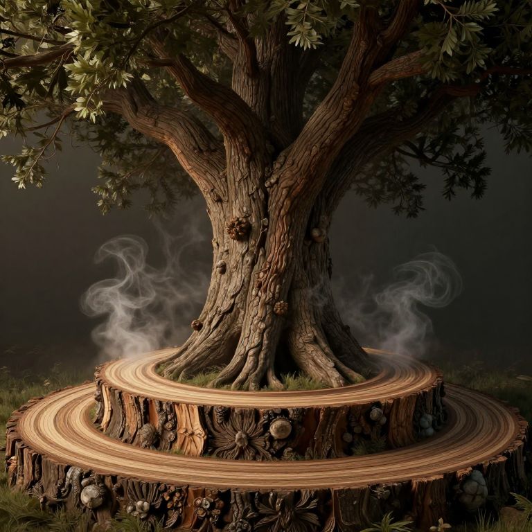 An atmospheric 3D-rendered scene depicts a colossal, ancient tree with intricate concentric rings encircling its base, each spiral representing a layer of time where the bark dissolves into ethereal smoke, evoking a mystical and nostalgic ambiance.