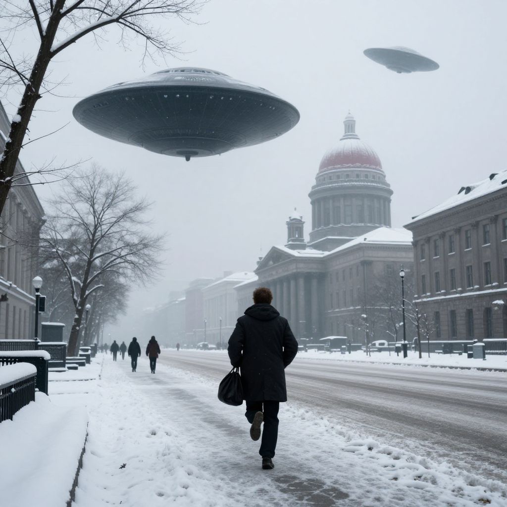 In the heart of a snowy, winter cityscape, a man dressed in a dark coat and carrying a bag runs through the streets, his path leading towards a majestic, snow-covered building with a red dome. A large, black, saucer-shaped UFO hovers above him, casting an eerie shadow on the ground. In the background, a smaller, sleeker UFO flies through the air, adding to the surreal atmosphere. The scene is framed by bare trees and a few other pedestrians, all shrouded in a misty, foggy ambiance that enhances the otherworldly feel of the image. The overall composition is dynamic, with the man's movement contrasting against the static, snow-laden buildings and the hovering UFOs, creating a sense of urgency and mystery.