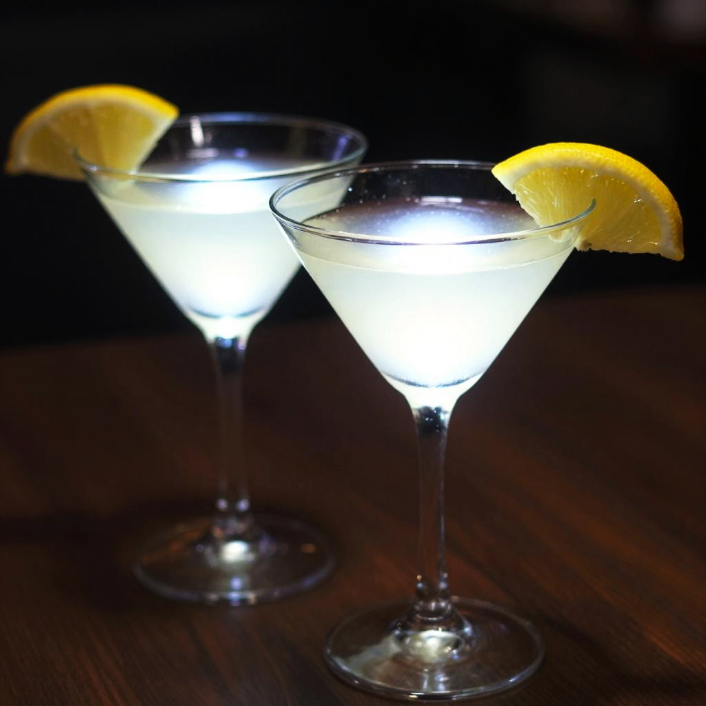 Photograph of two glowing martini glasses with bright, illuminated liquid, each garnished with a lemon wedge, on a dark wooden surface.