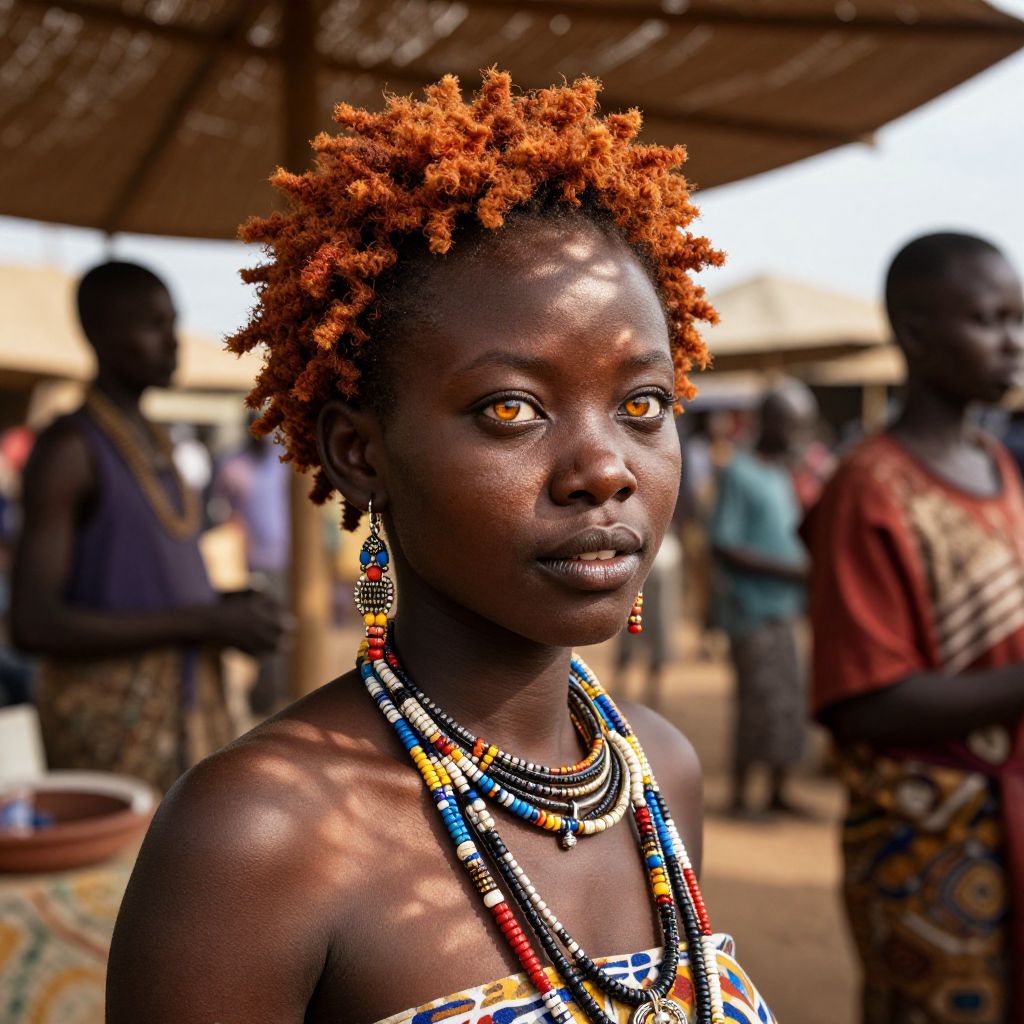 Photograph of a young African woman with dark skin and bright orange, curly hair. She wears multiple beaded necklaces and matching earrings, with a colorful patterned top. Her intense, amber eyes gaze directly at the camera. The background features a blurred outdoor market with other people, some wearing traditional clothing, and a thatched roof structure. Sunlight filters through, casting shadows on her face. The image has a high contrast, vibrant color palette, emphasizing the woman's striking features and intricate jewelry.