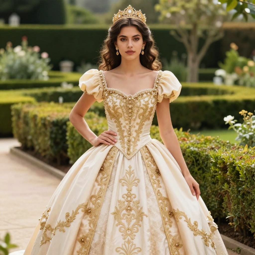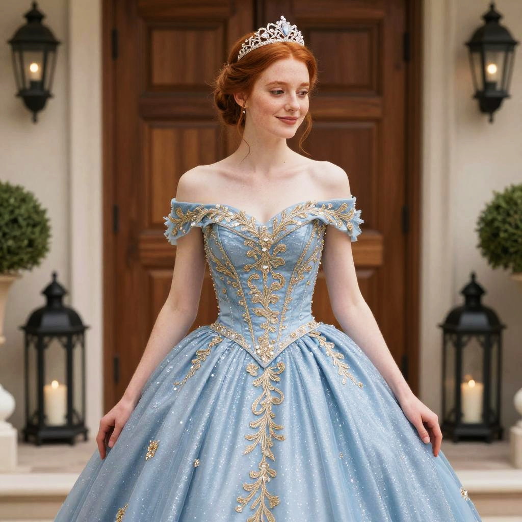 Fair-skinned red-haired woman wearing an off-the-shoulder, light blue glittery ball gown adorned with gold embroidery. She is styled with an elegant updo and a sparkling tiara, standing in front of a wooden door flanked by black lanterns and potted plants.