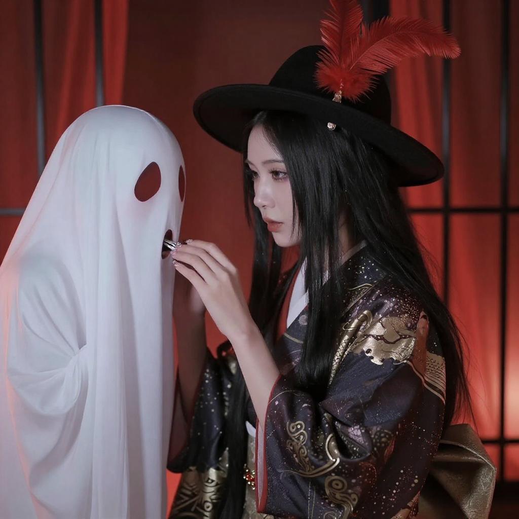 Digital artwork of an Asian woman with long black hair, wearing a black hat with a red feather, and a dark kimono with gold patterns, interacting with a white, red-eyed ghost. She holds a small object near the ghost's mouth. The background features red, glowing curtains and black metal bars. The woman's expression is focused.