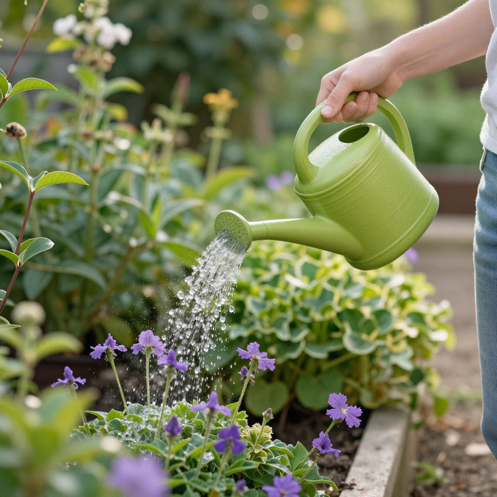 Woman watering vibrant garden plants with a green watering can amidst lush greenery and purple flowers under soft sunlight.