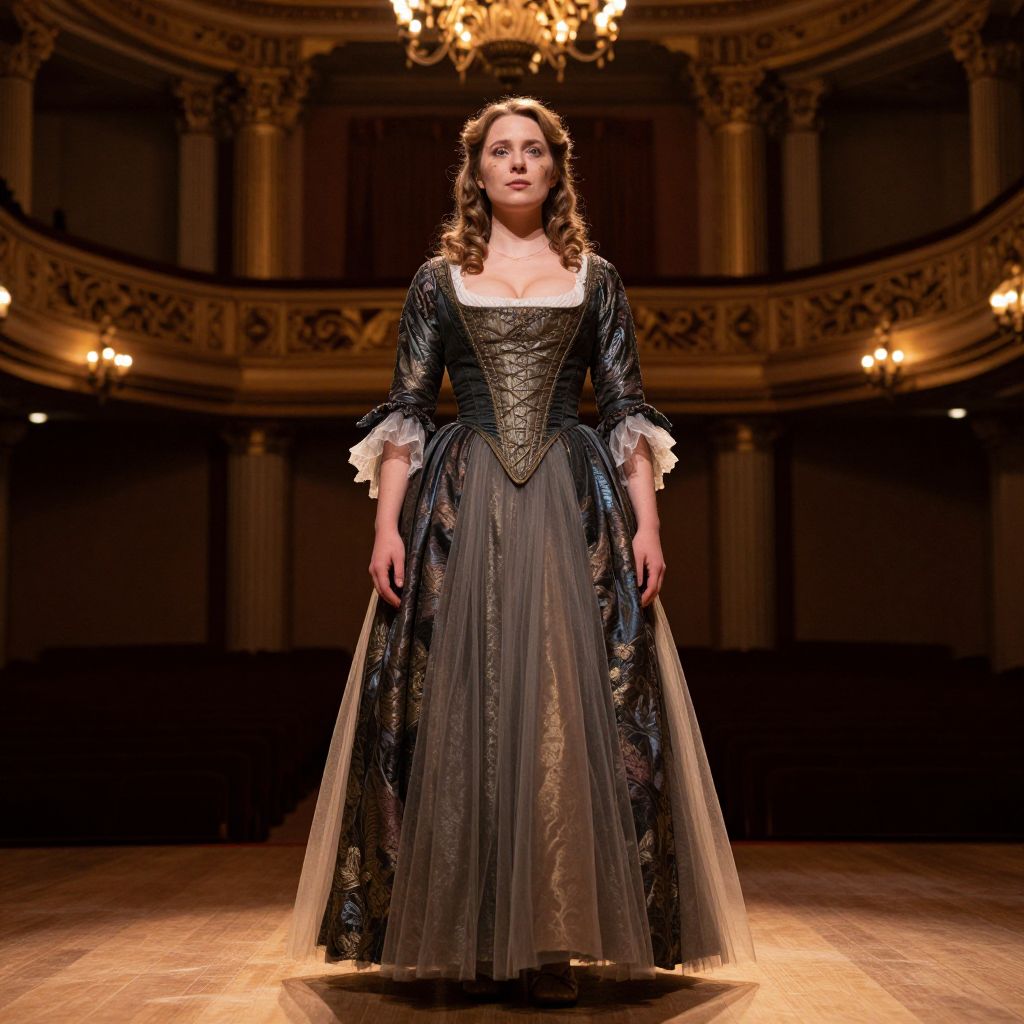 At a grand opera house during a midnight performance, a woman in her late 20s with golden-brown curls, soft blue eyes, and a subtle smudge of makeup wears a luxurious long costume dress with flowing tulle and dark brocade, the dress is part of a historical-inspired performance outfit; she glows under the stage lights, standing center stage with a serene gaze, the atmosphere is rich with ambiance and grandeur.. The woman has big breasts and cute face