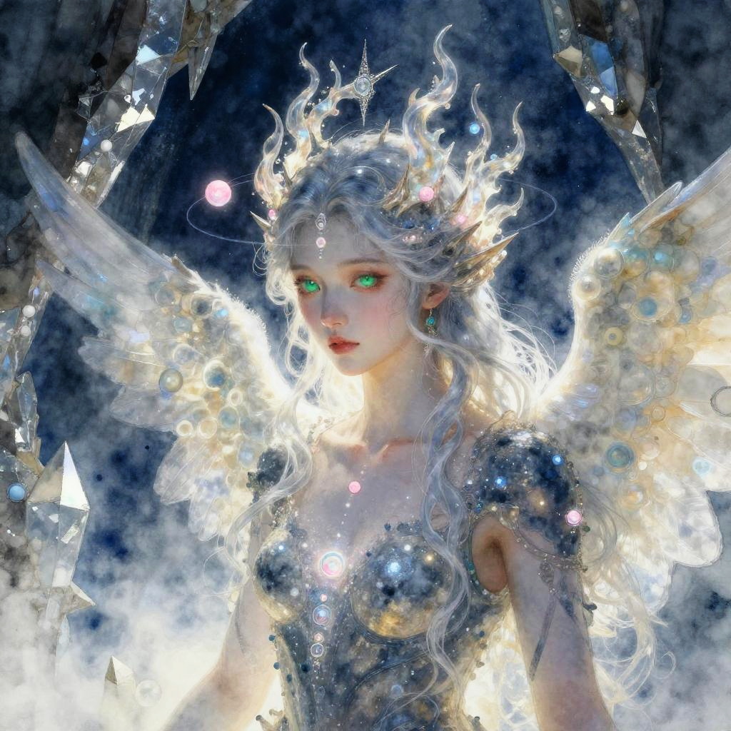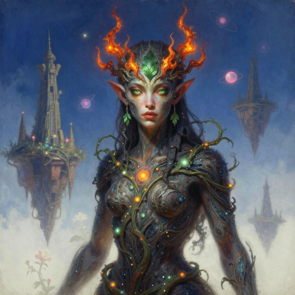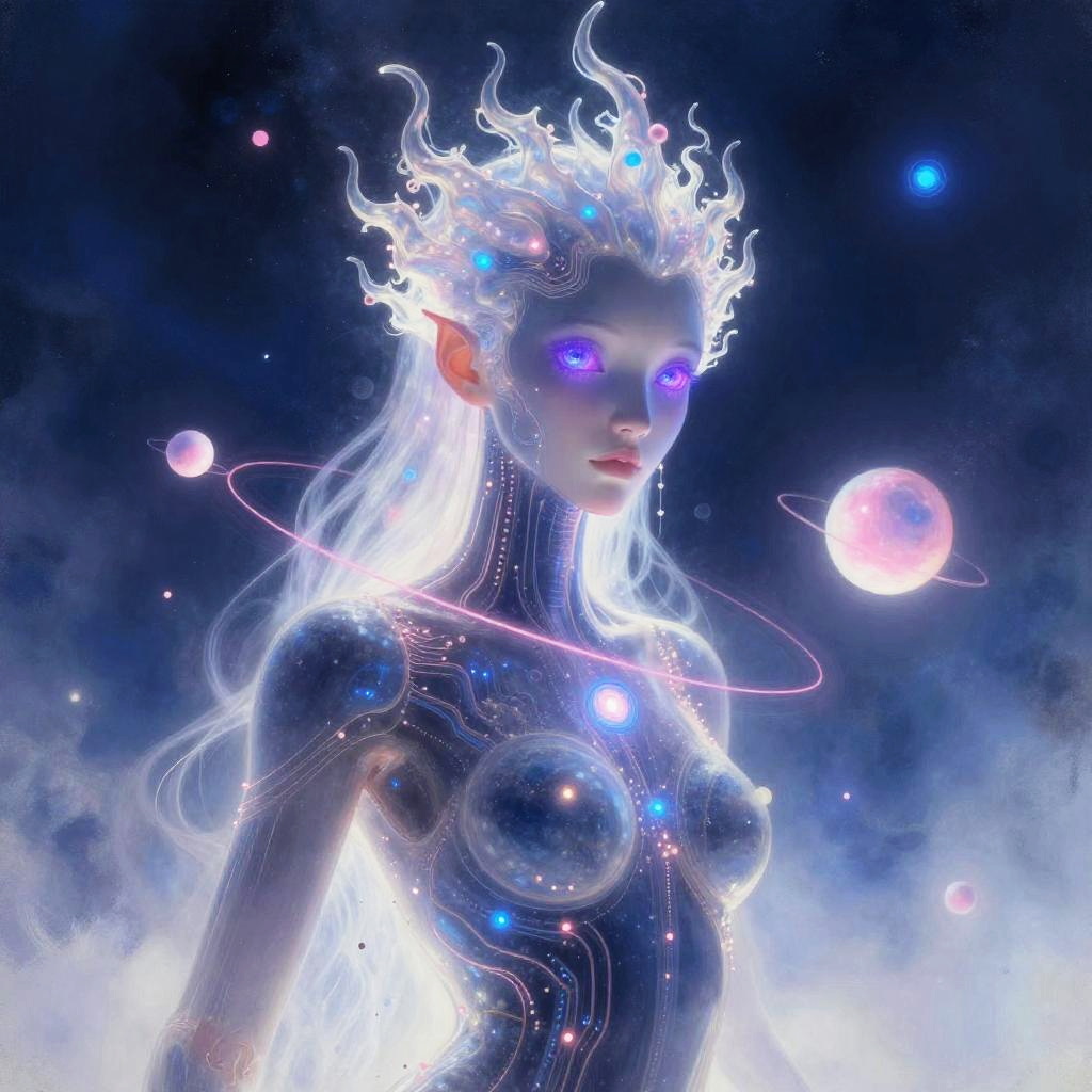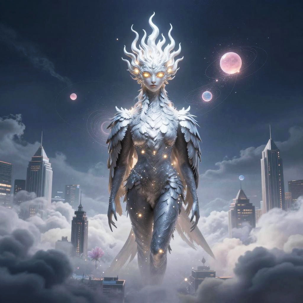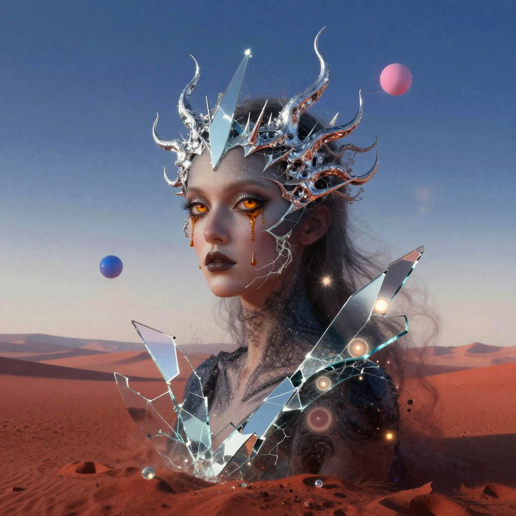 Surreal, otherworldly portrait set in crimson twilight over a shattered glass desert, focusing on shattered mirror spirit with silver shards and molten amber eyes. Crowned with fiery spiked tendrils, surrounded by pink and blue orbiting spheres and bioluminescent motes. Dark textured body dotted with glowing orbs, mystical aura. Background gradient from deep ultramarine to pearl white, soft bloom, rim lighting, volumetric haze, elegant composition. Rendered in surreal mixed media graphic novel style, ultra detailed, SDXL.