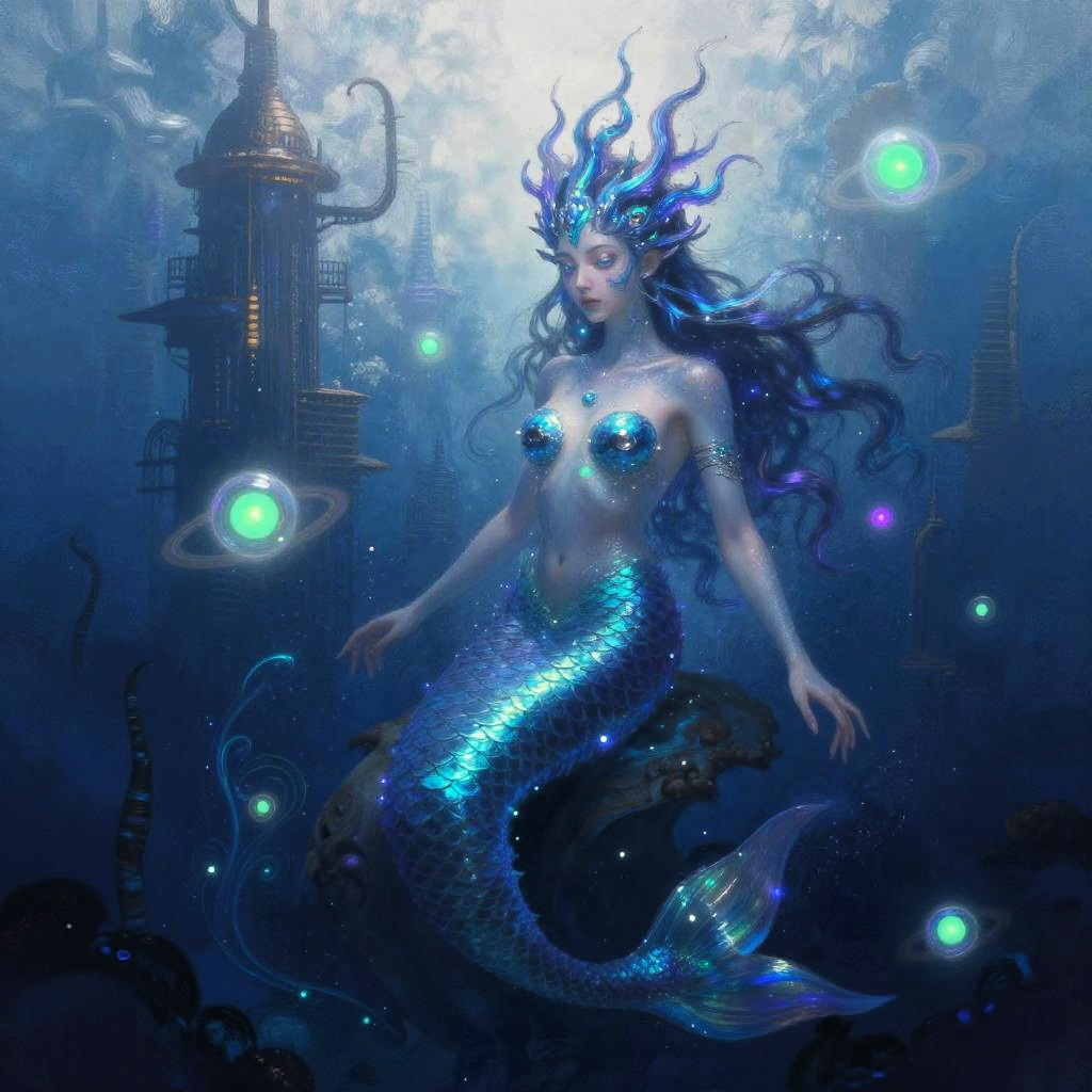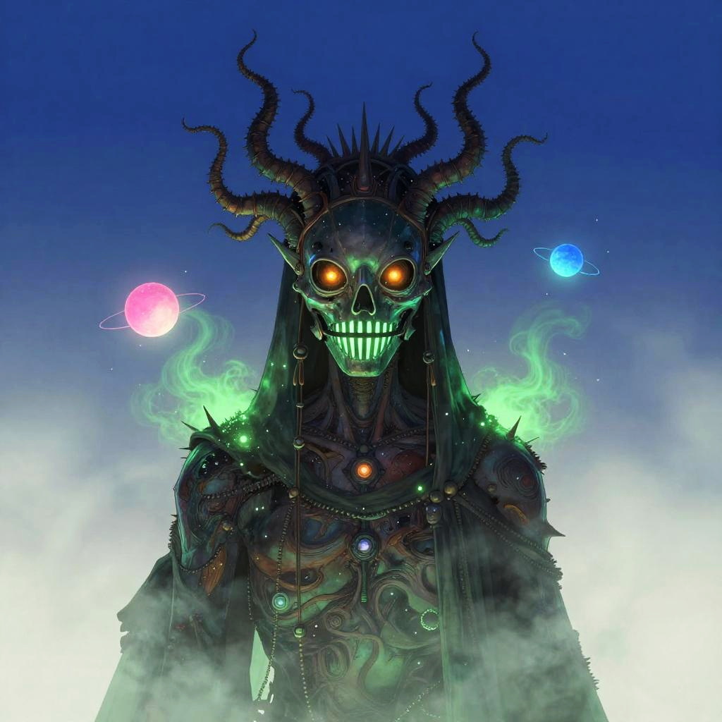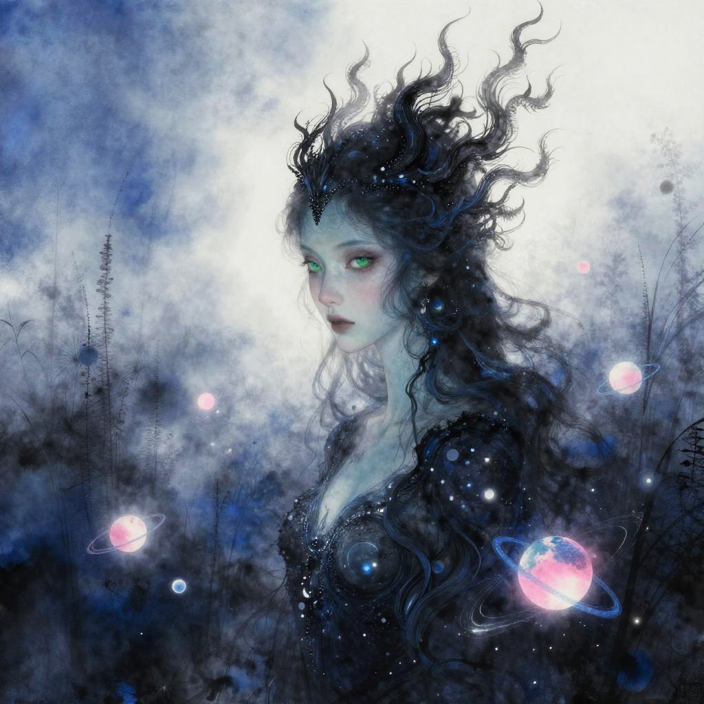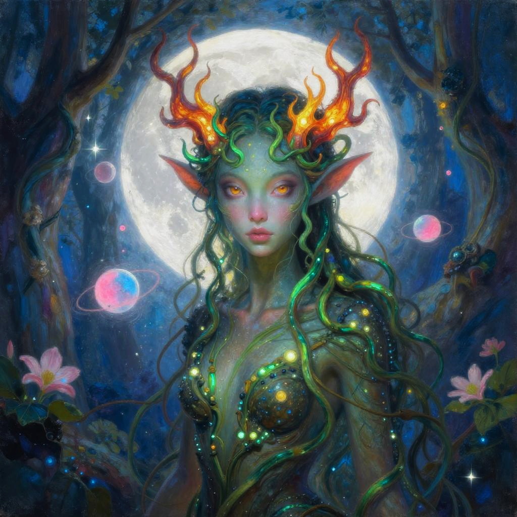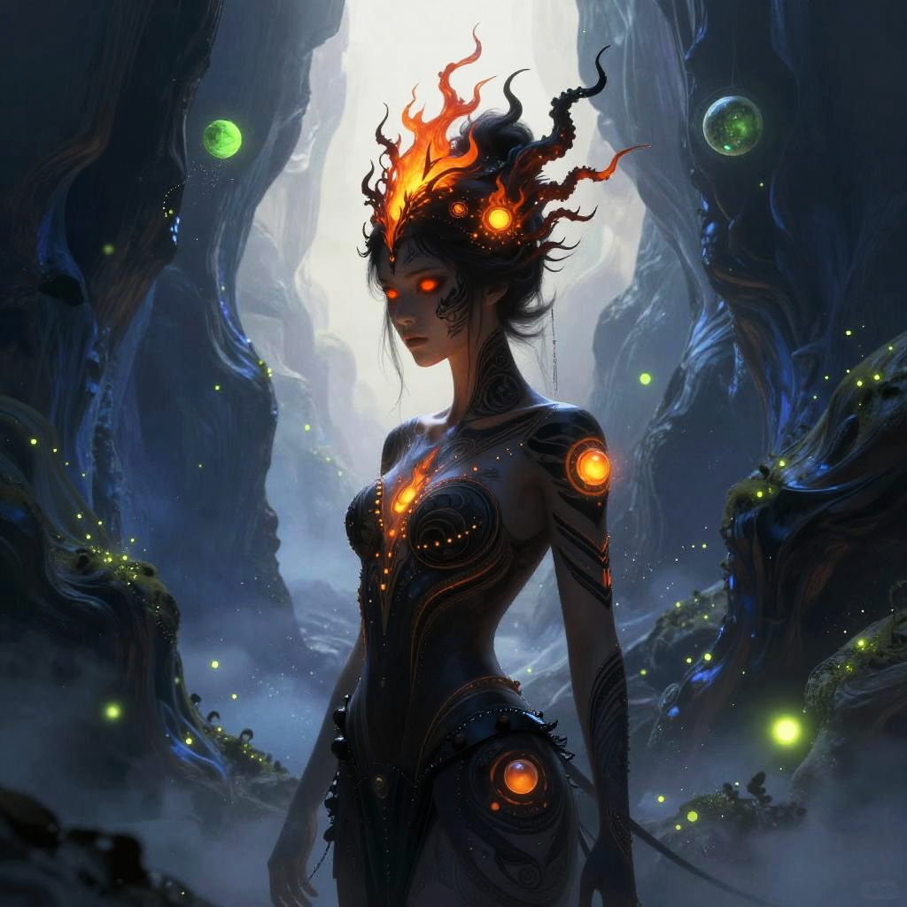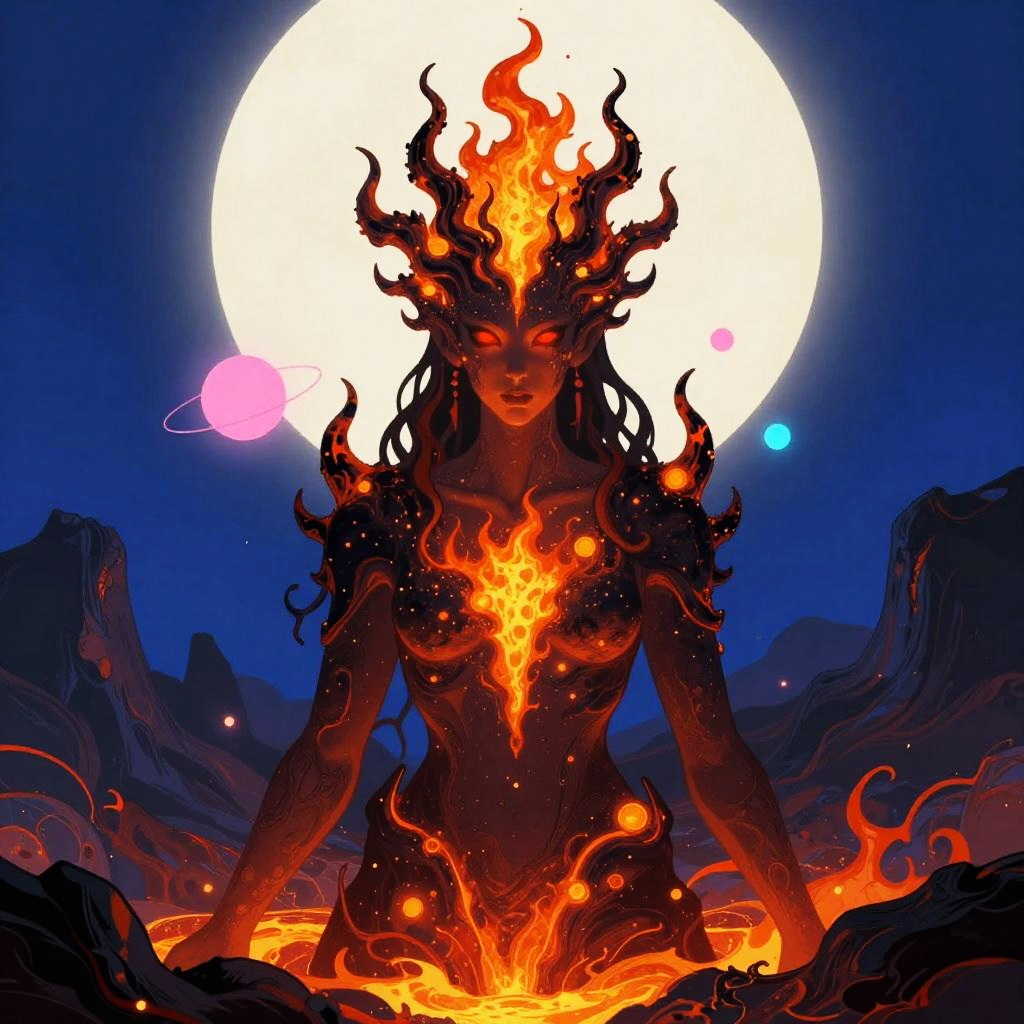 Surreal, otherworldly portrait set in crimson twilight over a shattered glass desert, focusing on shattered mirror spirit with silver shards and molten amber eyes. Crowned with fiery spiked tendrils, surrounded by pink and blue orbiting spheres and bioluminescent motes. Dark textured body dotted with glowing orbs, mystical aura. Background gradient from deep ultramarine to pearl white, soft bloom, rim lighting, volumetric haze, elegant composition. Rendered in surreal mixed media graphic novel style, ultra detailed, SDXL.