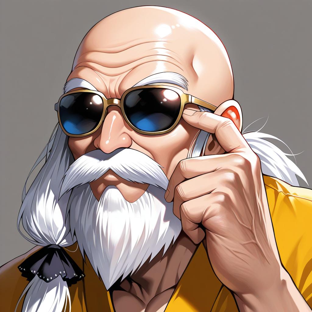 Muten roushi, dragon ball, 1boy, beard, mustache, white hair, sunglasses, bald, old man, by artist suou-sensei, illustrious