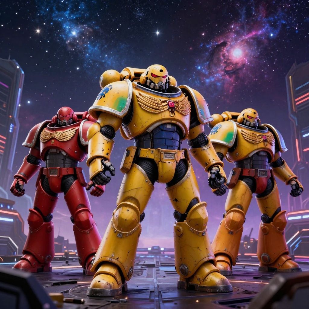 CGI image of three robotic warriors in a futuristic space setting. The central robot, with a yellow and black armor, stands tall, flanked by two red-armored robots. All have bulky, armored bodies with large, rounded shoulders and chests. The yellow robot's chest plate features intricate gold detailing. The background showcases a starry, galaxy-filled sky with vibrant colors and a bright, glowing sphere. The ground is metallic and reflective, with neon lights and futuristic structures visible in the distance. The image has a highly detailed, glossy, and vibrant style, emphasizing the sci-fi theme.