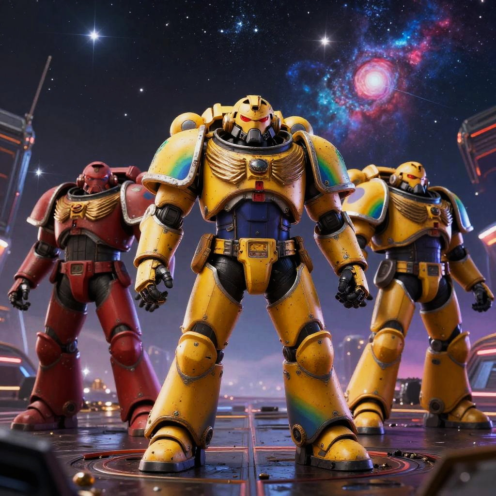 Pride Space Marines standing tall on a futuristic battlefield, vibrant rainbow armor gleaming under a cosmic sky filled with stars and nebulae, epic heroic pose, cinematic lighting