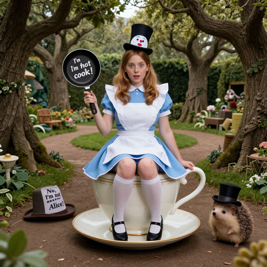 A humorous reimagining of Alice in Wonderland with a young, freckled woman in a full Alice costume, wearing a hat with a tiny face painted on it, sitting on a floating teacup while holding a frying pan labeled 'I'm the cook!', surrounded by absurd props like a hat that says 'No, I’m not Alice!' and a hedgehog wearing a top hat, set in a slightly skewed, detailed garden with exaggerated tree branches and crooked paths, cinematic realism. The woman has big tits and cute face