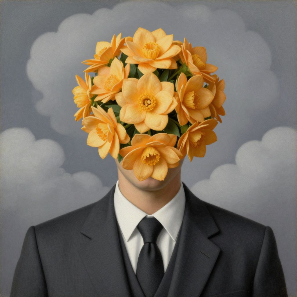 Portrait of a faceless beautiful flowers as head, man in a suit, clouds in the background, by rene magritte, detailed painting, distance, centered, hd, hq, high resolution, high detail, 4 k, 8 k