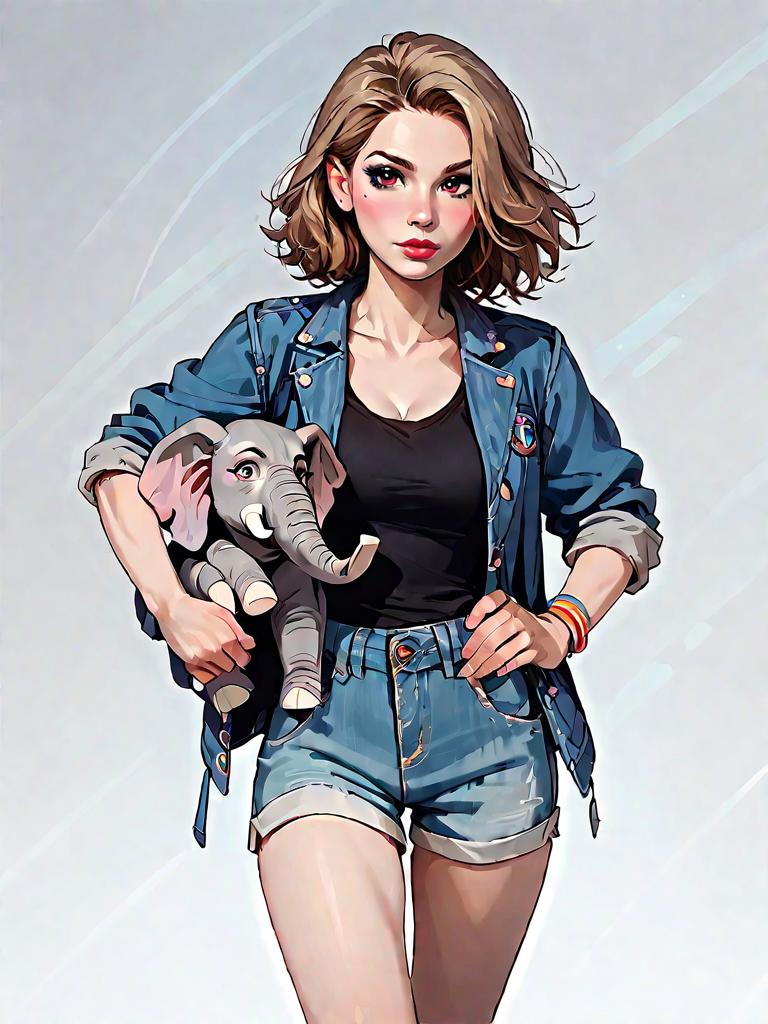 1girl, source_comics, realistic face, full body shot, Woman, casual, black tank top with elephant graphic, scoop neck, sleeveless, light brown suede shorts, mid-thigh length, carrying a light blue denim jacket, distressed look, rolled up sleeves, accessorized with layered bracelets of various materials and colors.