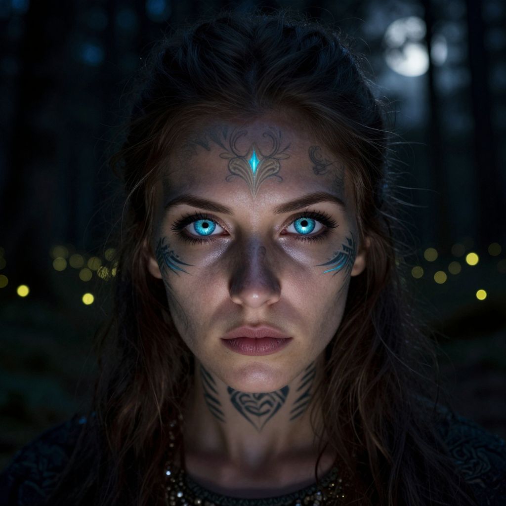 Envision a captivating portrait photograph of an enigmatic Slavic woman with piercing blue eyes and intricate facial tattoos glowing luminously against her skin. Captured from an unconventional bird's-eye perspective, this image emphasizes her mesmerizing gaze while the chiaroscuro lighting dramatically highlights the contrast between light and shadow across her striking features. Set amidst the serene moonlit forest illuminated by fireflies' ethereal glow, this portrait evokes a sense of mystery, tranquility, and deep connection with nature, inviting viewers to explore her enigmatic allure intimately.