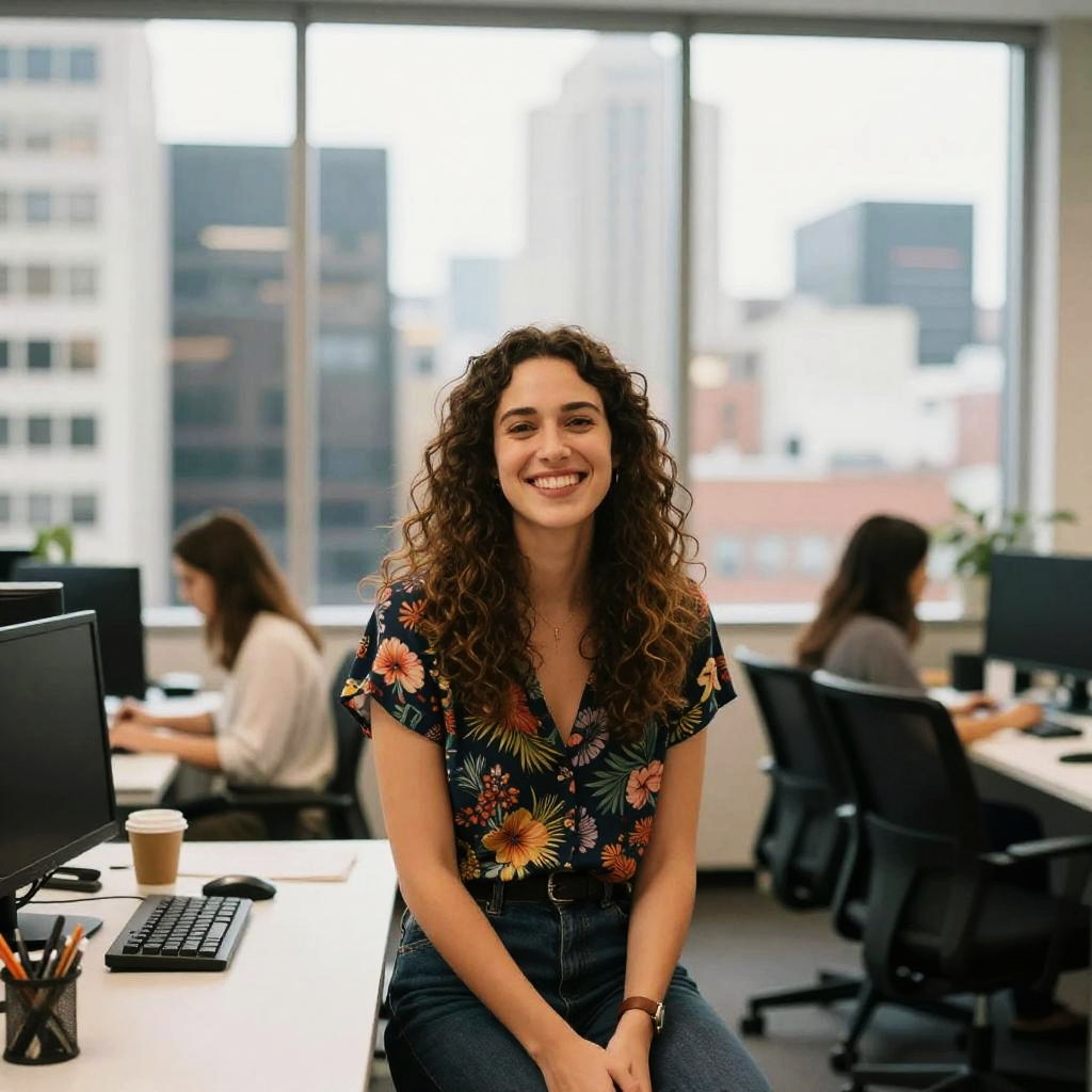 Realistic photo.Wide-Angle Cityscapes Portrait, eye-level, digital captured using Nikon Z6 II with a 50mm f/1.4 lens in the style of environmental portrait photography, Emma Johnson, a tall and cheerful Australian woman with curly brown hair, wearing a floral blouse and sitting on a desk chair in a busy office, light-hearted and kind expression, deep depth of field and natural lighting, slight blur, stylized 75 realistic photo