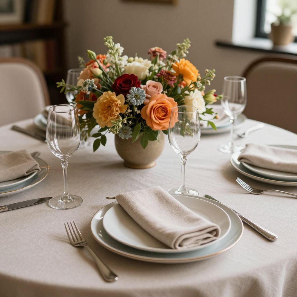 A harmonious blend of elegance and warmth, this table setting invites celebration and connection, where the vibrant floral centerpiece symbolizes life's beauty, while the soft textures and muted tones evoke a sense of serenity and timeless grace.