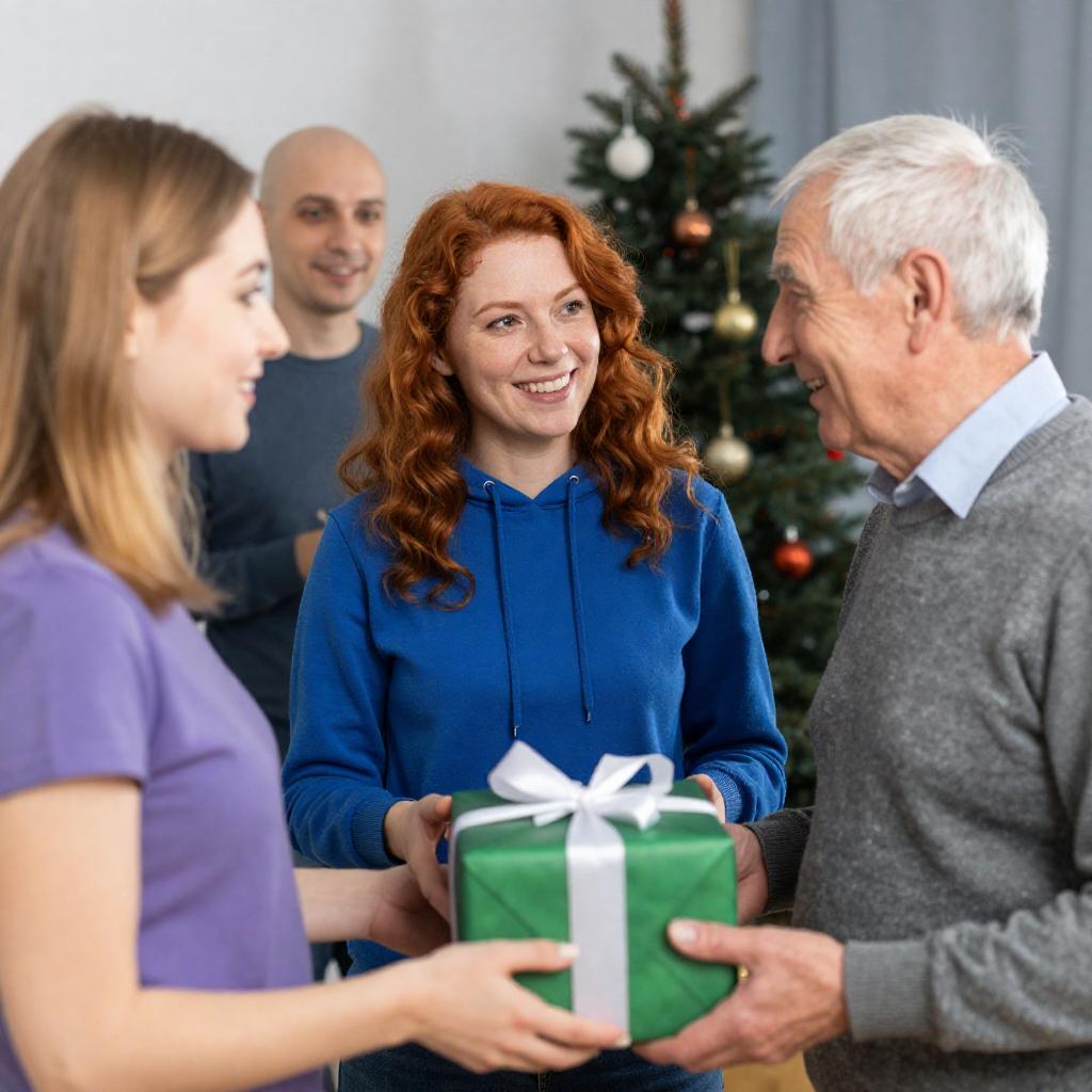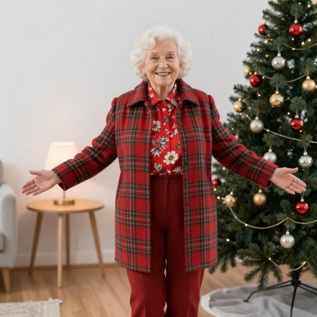 Photograph of two older adults sitting on a brown tufted couch. Man with gray hair, maroon sweater, dark pants, smiling. Woman with blonde hair, red and white patterned sweater, gray pants, holding wooden box with red lights, smiling. Christmas decorations in background. Both hands resting on couch. Warm indoor lighting. Woman's right hand on box, man's left hand on lap. Cozy, festive atmosphere.