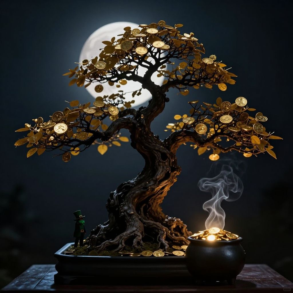 Dark bonsai tree, twisted silhouette, leprechaun, pot of gold, moonlight filtering through branches, gold coins leaves, glowing pot, wisps of smoke, eerie, mysterious, detailed, cinematic lighting