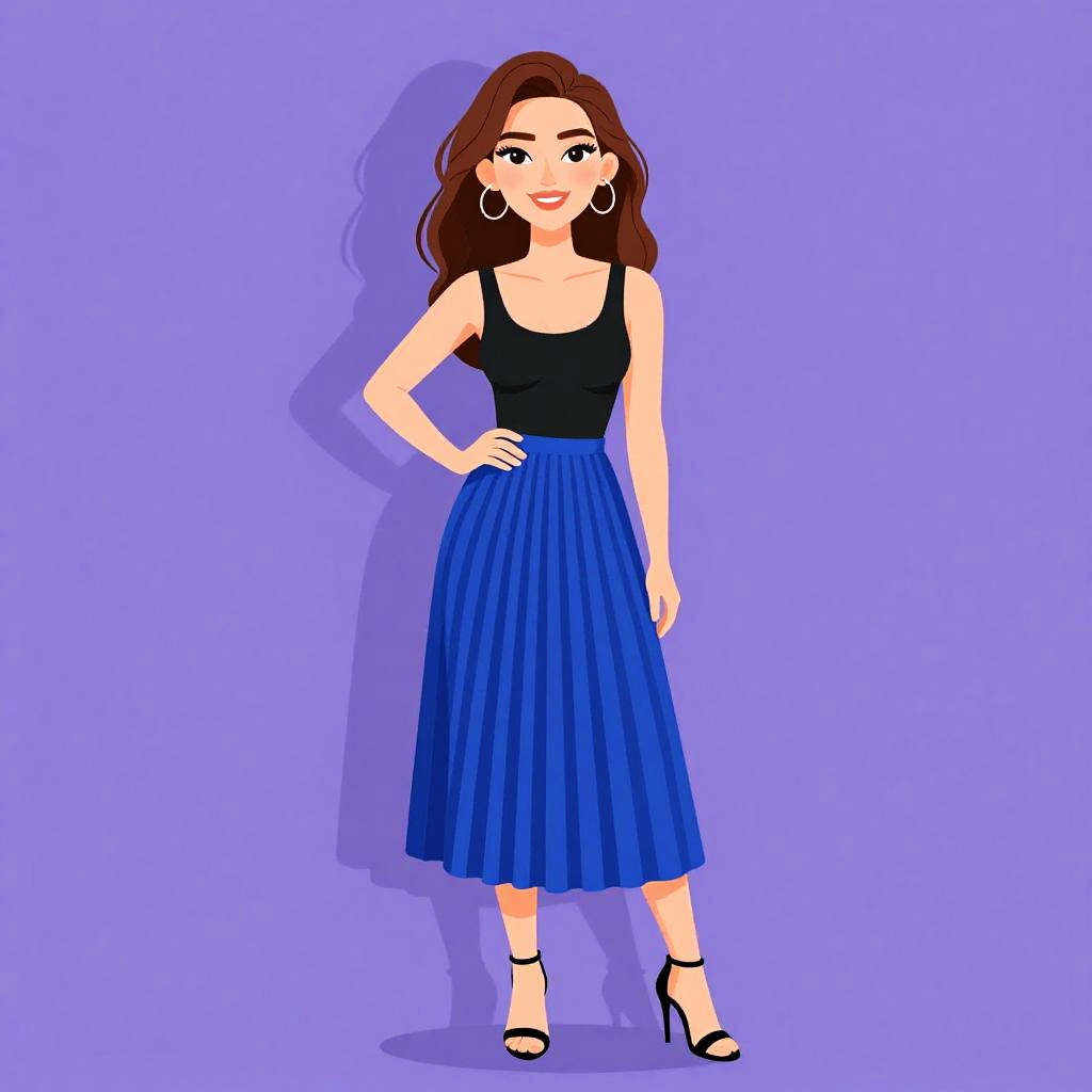 Digital illustration of a smiling woman with wavy brown hair, wearing a blue floral crop top, high-waisted beige pants, and black ankle boots