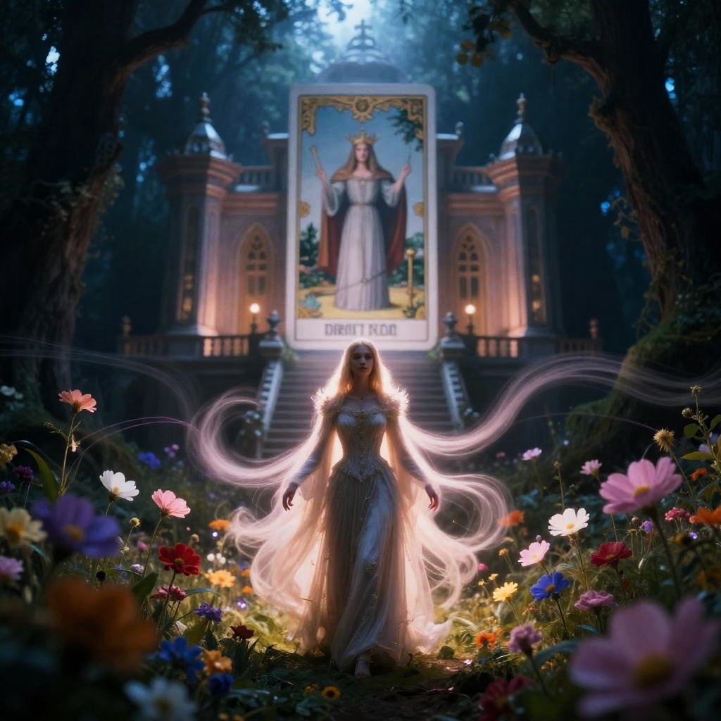 ((cinematic lighting, depth of field, motion blur, motion lines))), solo, ((night:1)), ((dark woods:1)), (moody lighting), (Glowing ambiance, enchanting radiance, luminous lighting, ethereal atmosphere, mesmerizing glow, evocative hues, captivating coloration, dramatic lighting, enchanting aura), (a field of flowers, palace, high priestess tarot card, full-cosplay, nymphaea), (masterpiece, top quality, best quality, official art, beautiful and aesthetic:1.2), extreme detailed, theater scene, (hypermaximalistic:1.5), colorful, highest detailed, ((Renaissance))