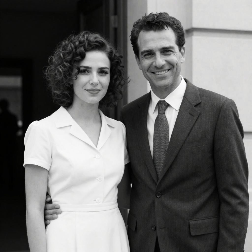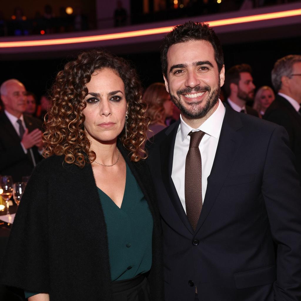 Photograph of three people in an indoor setting. Central woman in green dress, embraced by two men; one in blue shirt, other in white shirt. Woman's arm over blue-shirt man's shoulder. Background includes tables, chairs, and dim lighting.