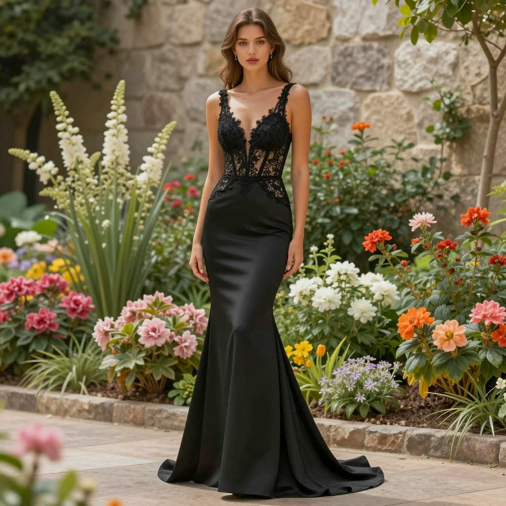 A beautiful woman with long brown hair wearing a strapless royal blue mermaid evening gown with a deep V-neckline and high slit. She stands confidently in a vibrant outdoor flower garden filled with colorful roses and peonies. The scene is bright and summery with green foliage and a white fence in the background. She completes the elegant look with black high heels and hoop earrings.