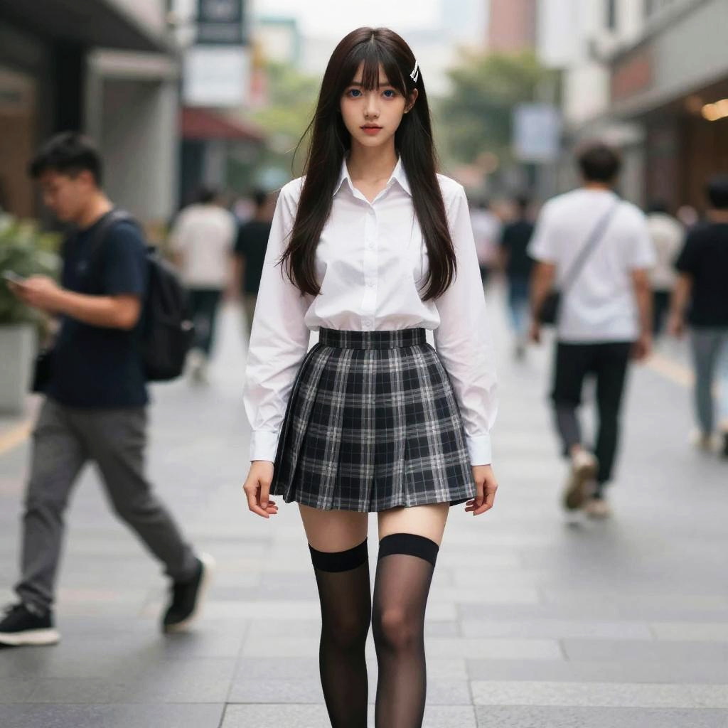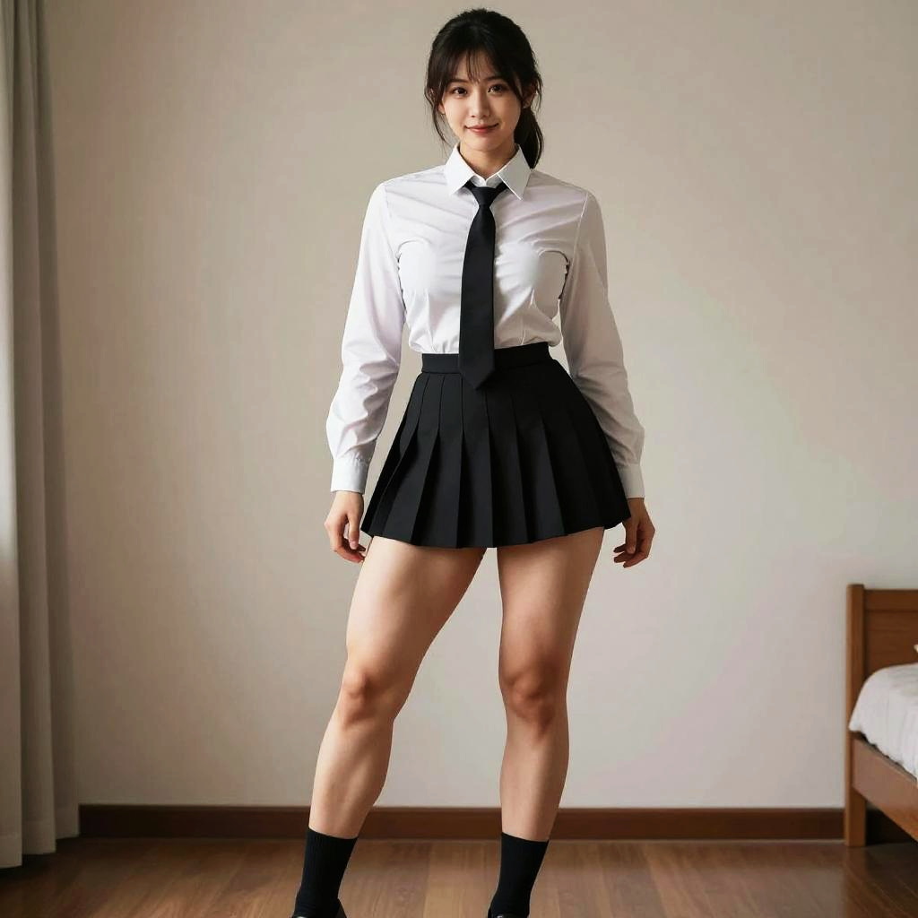 (masterpiece, 4k, ultra detailed:1.2), (beautiful face:1.2), (anime:1.2), illustration, (realistic:1), (1girl:1.2), (smirk, smug:1), (looking at viewer:1.4), portrait, (fullbody:1.2), (standing:1.2), (supermodel:1.4), (indoor, bedroom:1.2), (simple background:1.2), (tie, schoolgirl_uniform, long sleeve dress shirt, black pleated skirt, socks:1.2), (black_hair), (medium length hair, ponytail), (cleavage:0.5), (wide_hips:1), (milf, mature, 35 years old:1.2), (curvy:1.1), (flat che BREAK 1), (muscular:1.2), (calf muscle, thigh muscle:1.5), muscular male, strong calf muscles, defined thigh muscles, athletic build, high muscle definition, realistic anatomy, dynamic pose, detailed muscle shadows, skin texture, natural lighting