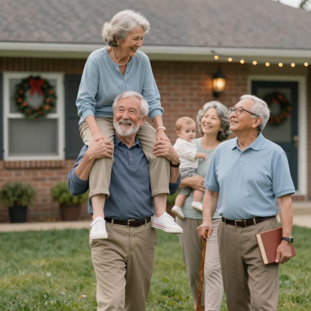Photograph of a hallway with three people. Elderly woman in blue shirt, pushed in wheelchair by man in purple shirt. Second man in purple shirt walks beside. Brick walls, large windows, paintings on left. Bright natural light.