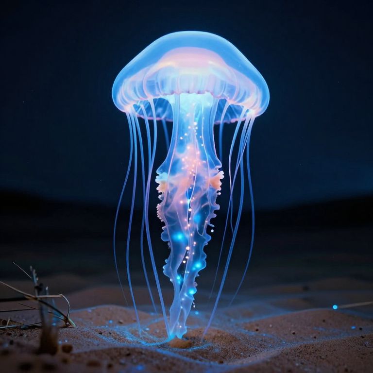Photograph of a glowing blue jellyfish with translucent, undulating tentacles, floating on a dark sandy ocean floor, illuminated against a deep blue night