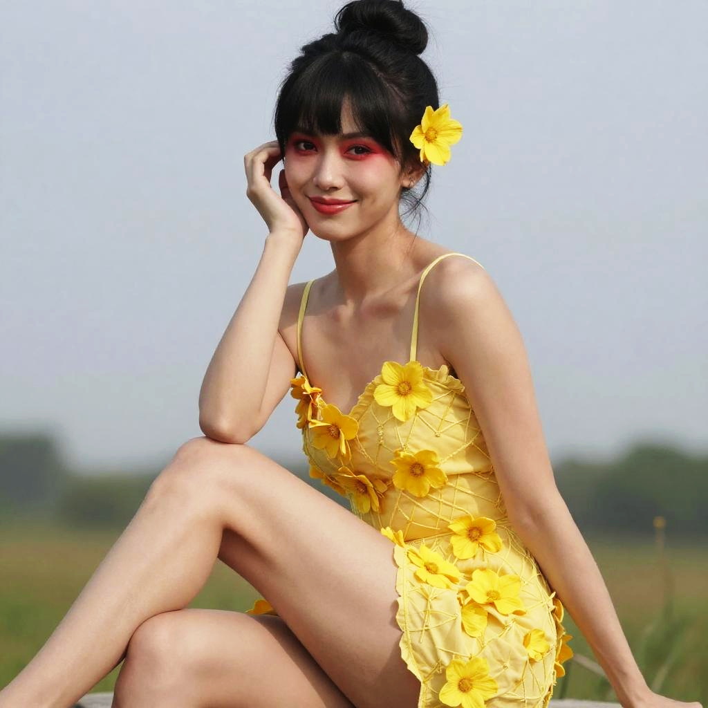 Photograph of a young Asian woman with fair skin and black hair in a bun, adorned with a yellow flower. She is sitting outdoors in a grassy field with a blurred, light blue sky background. She wears a yellow, floral-embellished, spaghetti-strap dress that accentuates her slender figure. Her right hand rests on her cheek, and she smiles softly with bright red lipstick. Her left leg is bent, showcasing her smooth, bare legs. The dress's texture is delicate and floral, contrasting with her smooth skin. The overall mood is serene and natural.