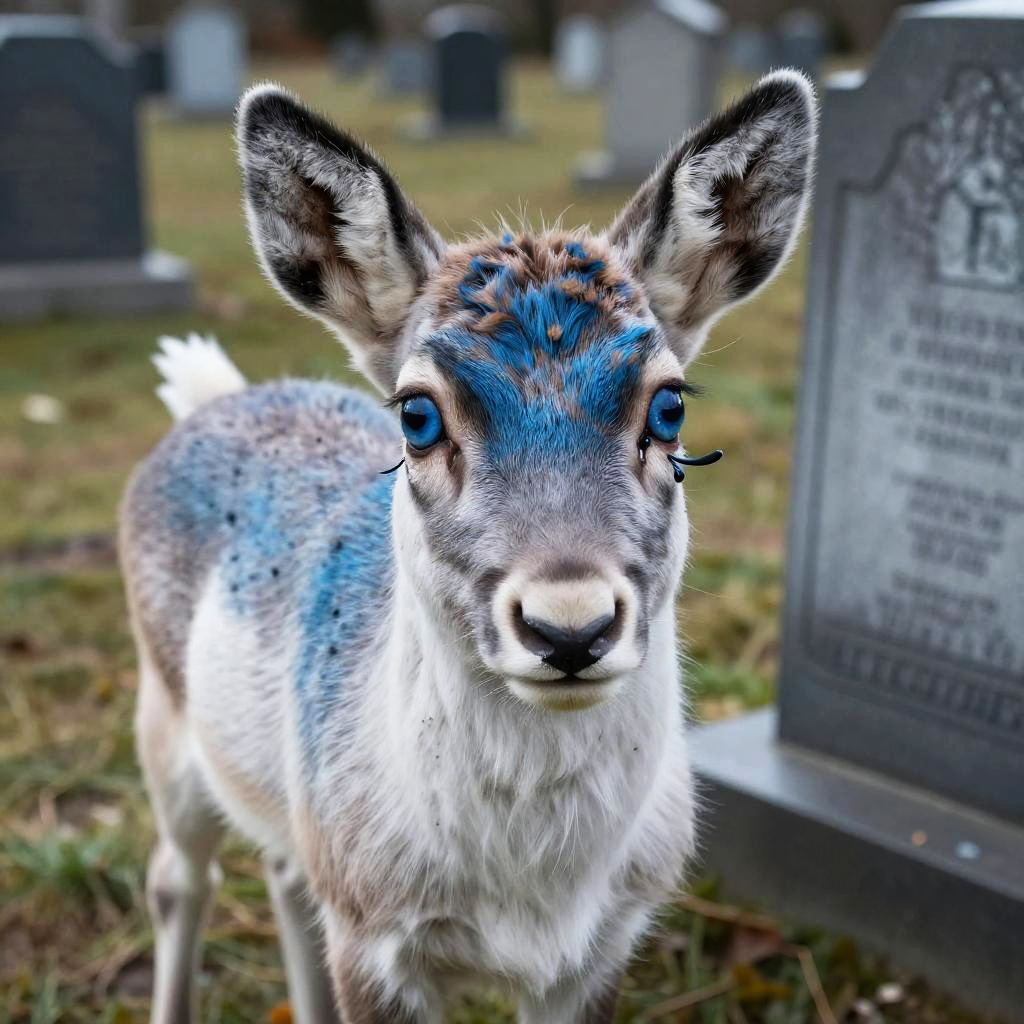 Cervid, mammal, female, blue fur, white fur, countershading, young, feral, blue eyes, big eyes, selfie, looking at viewer, cemetery, tombstone, scut tail, realistic custom_embed, tears, mascara, running mascara, insincere, sad, <|startoftext|> by lunalei, by fivel, by bonifasko, by leonid afremov