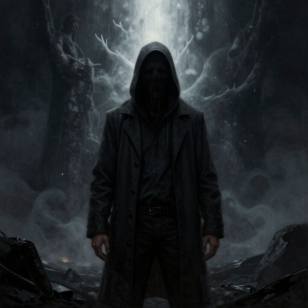 A digital artwork depicts a shadowy figure standing in a dark, stormy landscape. The figure, centered in the image, wears a long, hooded coat that obscures their face, creating a mysterious and ominous appearance. Lightning bolts and dark, swirling clouds illuminate the background, casting a stark, white light on the figure's hood. The ground is rocky and wet, with dark, shadowy textures. The overall color palette is dominated by dark blues and blacks, with the bright white lightning providing a dramatic contrast. The style is dark fantasy, evoking a sense of foreboding and mystery.