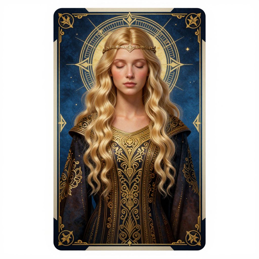 This is a digital illustration of a serene, fair-skinned woman with long, wavy, golden blonde hair, wearing a black, intricately patterned robe with gold embellishments. She has a calm expression with closed eyes and is adorned with a simple golden headband. A circular halo with geometric patterns surrounds her head against a dark blue, starry background. The image has a card-like appearance with rounded corners, and the edges are decorated with gold designs. The overall style is reminiscent of medieval or fantasy art, with a mystical, ethereal quality.