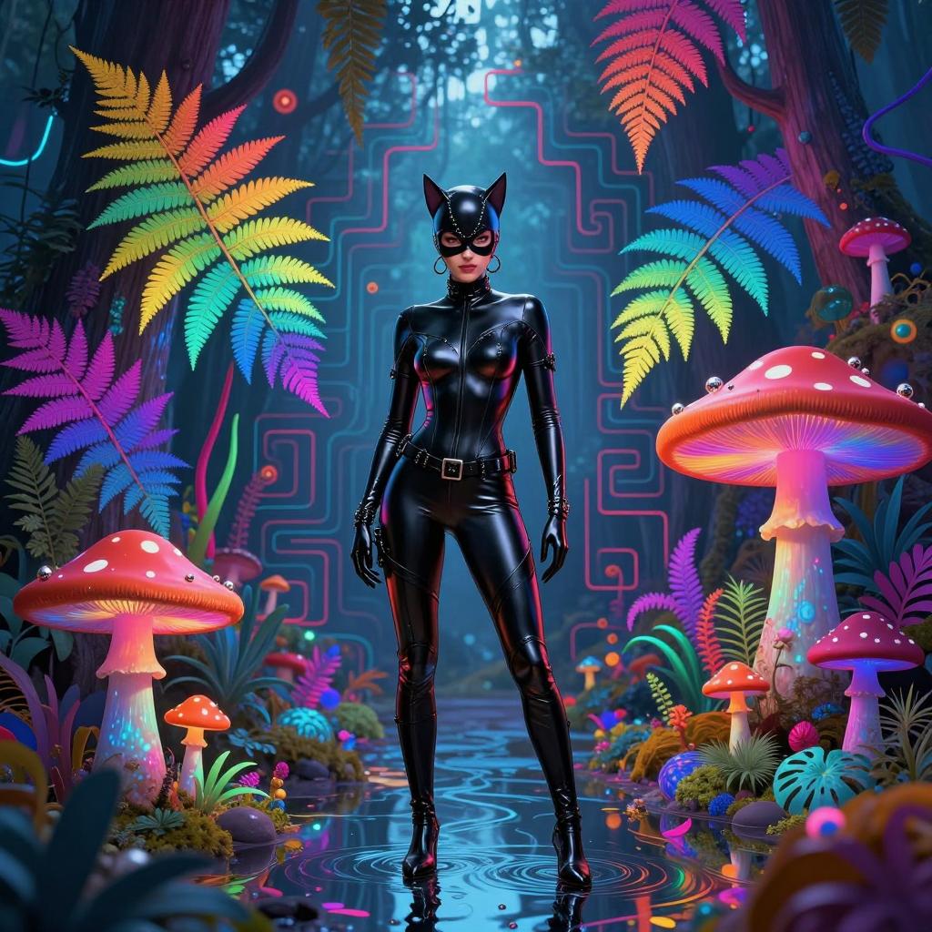 Catwoman fractal ferns, in acid rainbow fore BREAK : ray tracing, water reflection, silver berry:: In the rainbow colorful forest, magic mushrooms, fractalic fern:: psychedelic, neon Mesoamerican, labyrinth, maze Colorful, funk art, psychedelic Schematic, modern,, ray tracing reflections, silver berry highlights, rainbow colorful forest, magic mushrooms, fractal fern patterns, psychedelic neon Mesoamerican colors, labyrinth maze geometry, vibrant funk art, schematic modern design, glowing neon accents