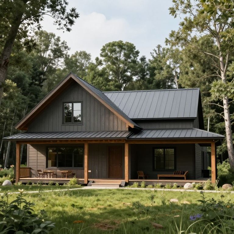 Photograph of a modern, dark gray, two-story cabin with a black metal roof, wooden porch, and surrounded by lush green trees and grass.
