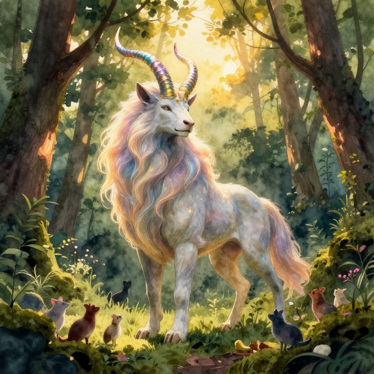 A majestic mythical beast stands regally in a verdant, vibrant forest at sunset, its iridescent horn reflecting the golden rays of light filtering through the dense foliage above. The creature's otherworldly beauty harmonizes seamlessly with the natural surroundings, as if it has always been an integral part of this enchanted landscape. Captured from a low-angle perspective, the camera showcases intricate details of the beast's delicate hooves pressing gently into the soft moss-covered earth while emphasizing its serene expression and flowing, shimmering mane. The scene transitions smoothly from the tranquil solitude of the creature in the clearing to the lively activity of woodland creatures gathering around it, creating an emotional gradient that evokes a sense of wonder, curiosity, and harmony with nature. Inspired by dreamlike watercolor paintings, this image celebrates the magic and mystery of untamed wilderness while emphasizing the beauty and power inherent in the ethereal creature at its heart.