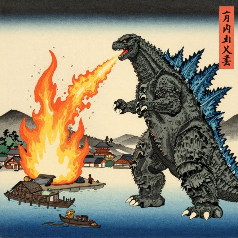 Godzilla Fire Breathing Over Japanese Village