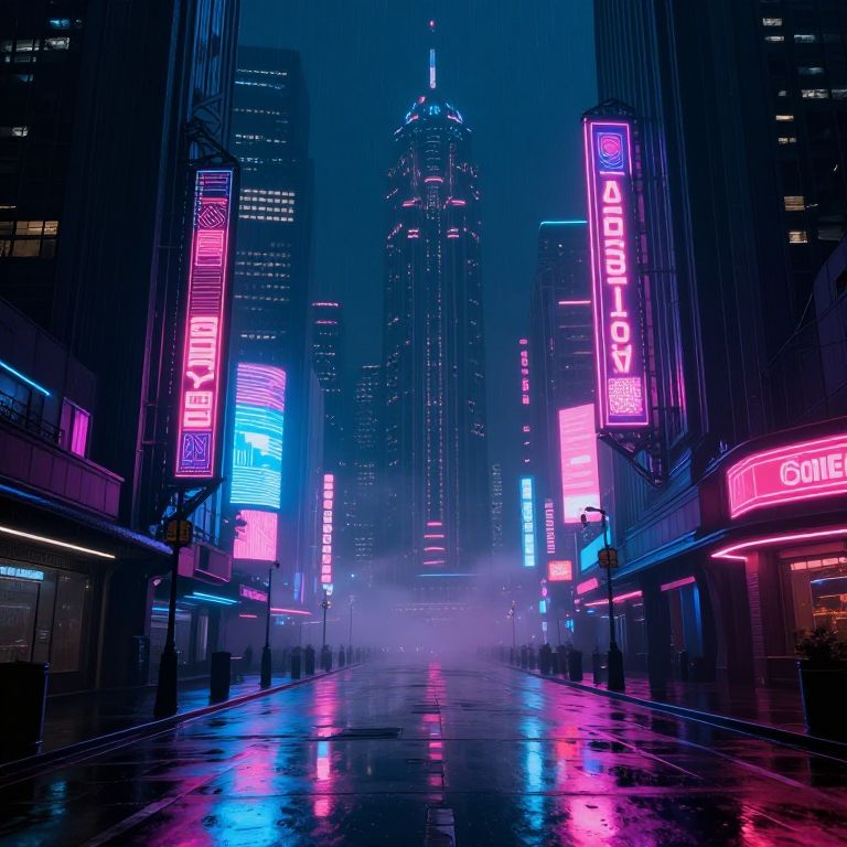Dall-E art styles capturing cyberpunk cityscapes drenched in neon lights, rain-soaked streets reflecting vivid holographic signs, intricate architectural details, atmospheric depth with fog and glow effects, merging sci-fi aesthetics with art deco influences.