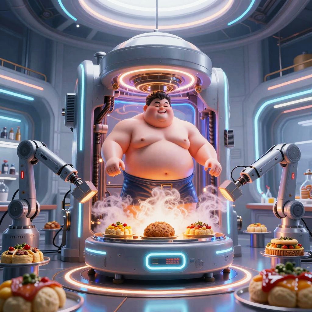 Fat maker, a futuristic machine in a vibrant sci-fi laboratory, glowing with neon lights and emitting thick, swirling smoke, surrounded by robotic arms crafting oversized food items, highly detailed, cinematic lighting, ultra-realistic style