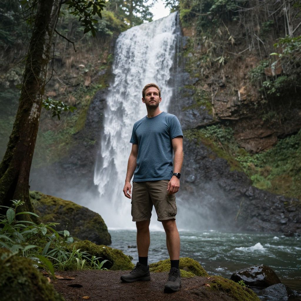 An artistic portrayal of a man standing confidently in a lush forest with a scenic waterfall in the background, evoking a sense of adventure and tranquility.