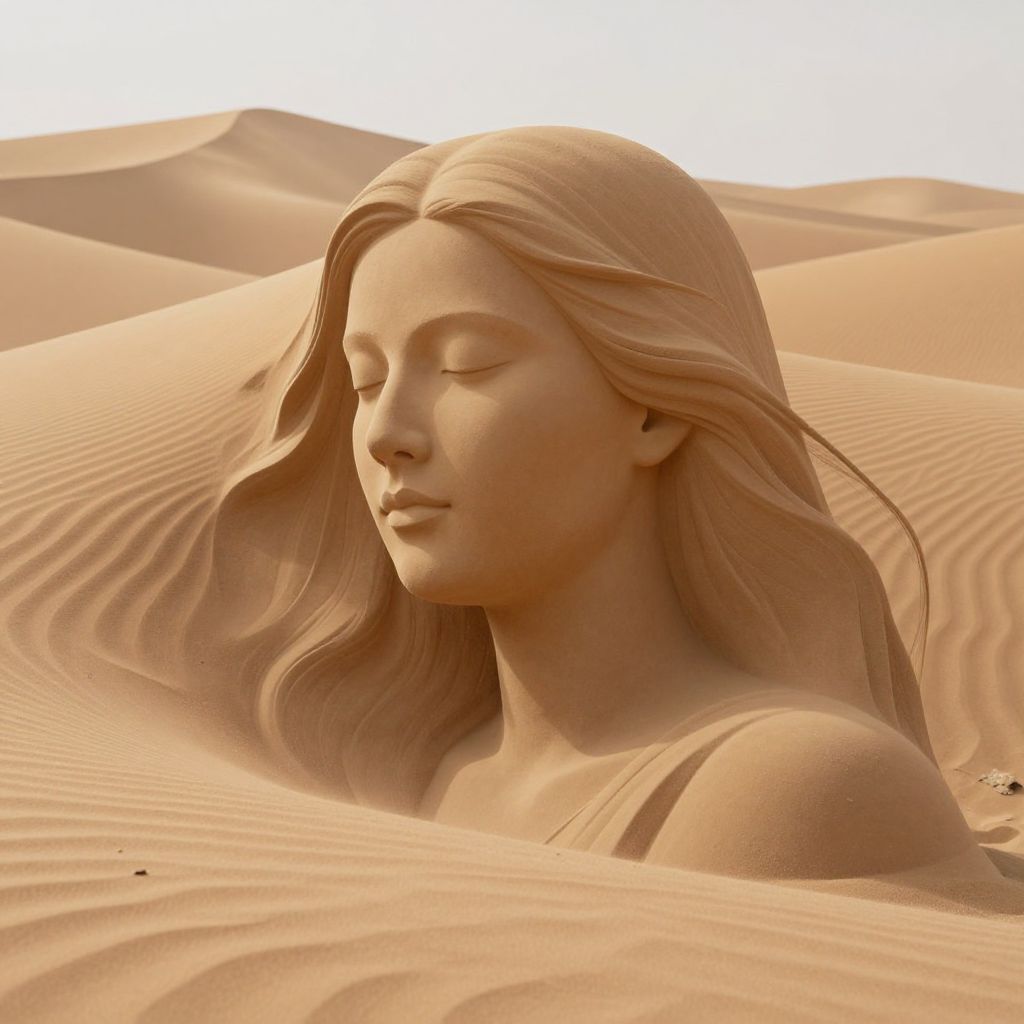 Sculpted sand dunes seamlessly merge into the ethereal visage of a serene woman, her features emerging as if carved by the whispering winds of an ancient desert landscape.